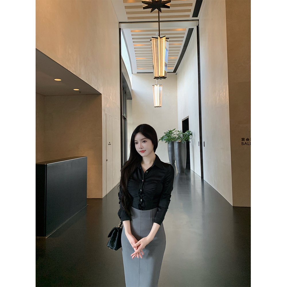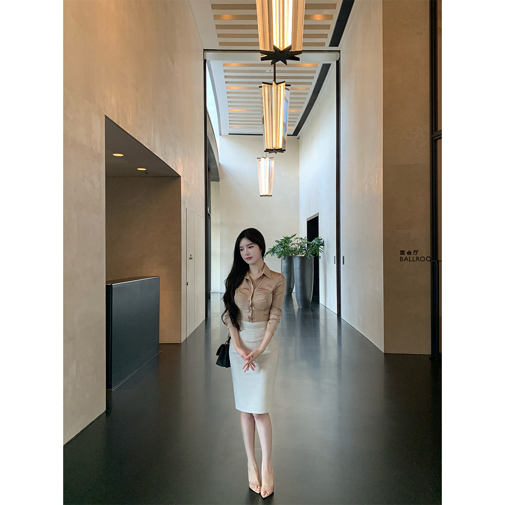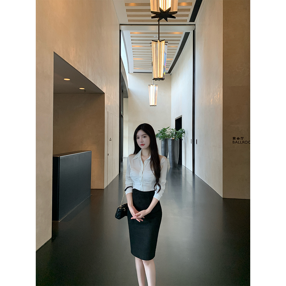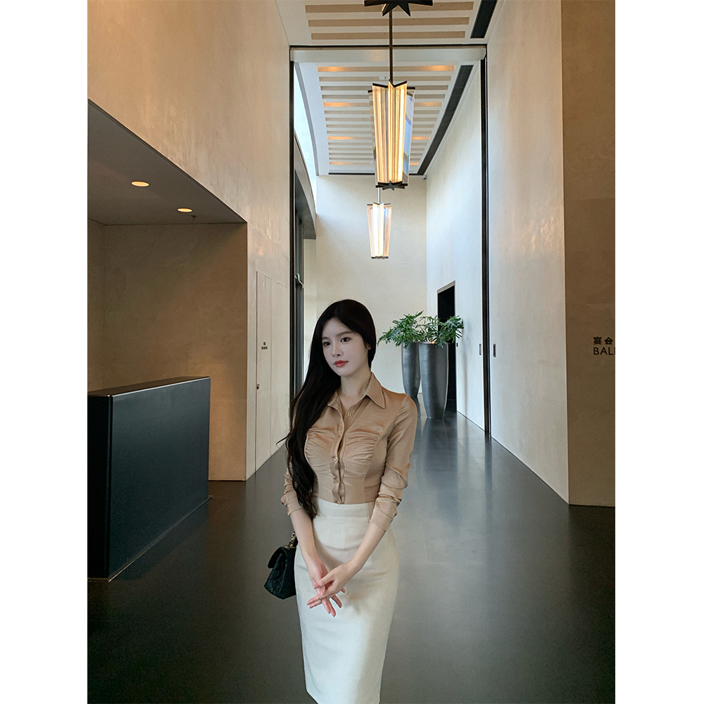 通勤百搭褶皱缎面衬衣/麂皮半裙