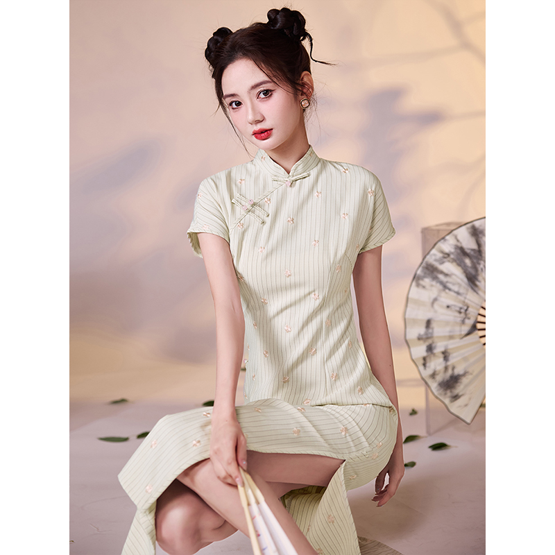 条纹旗袍2025新款夏季小清新连衣裙文艺复古民国风刺绣年轻款少女