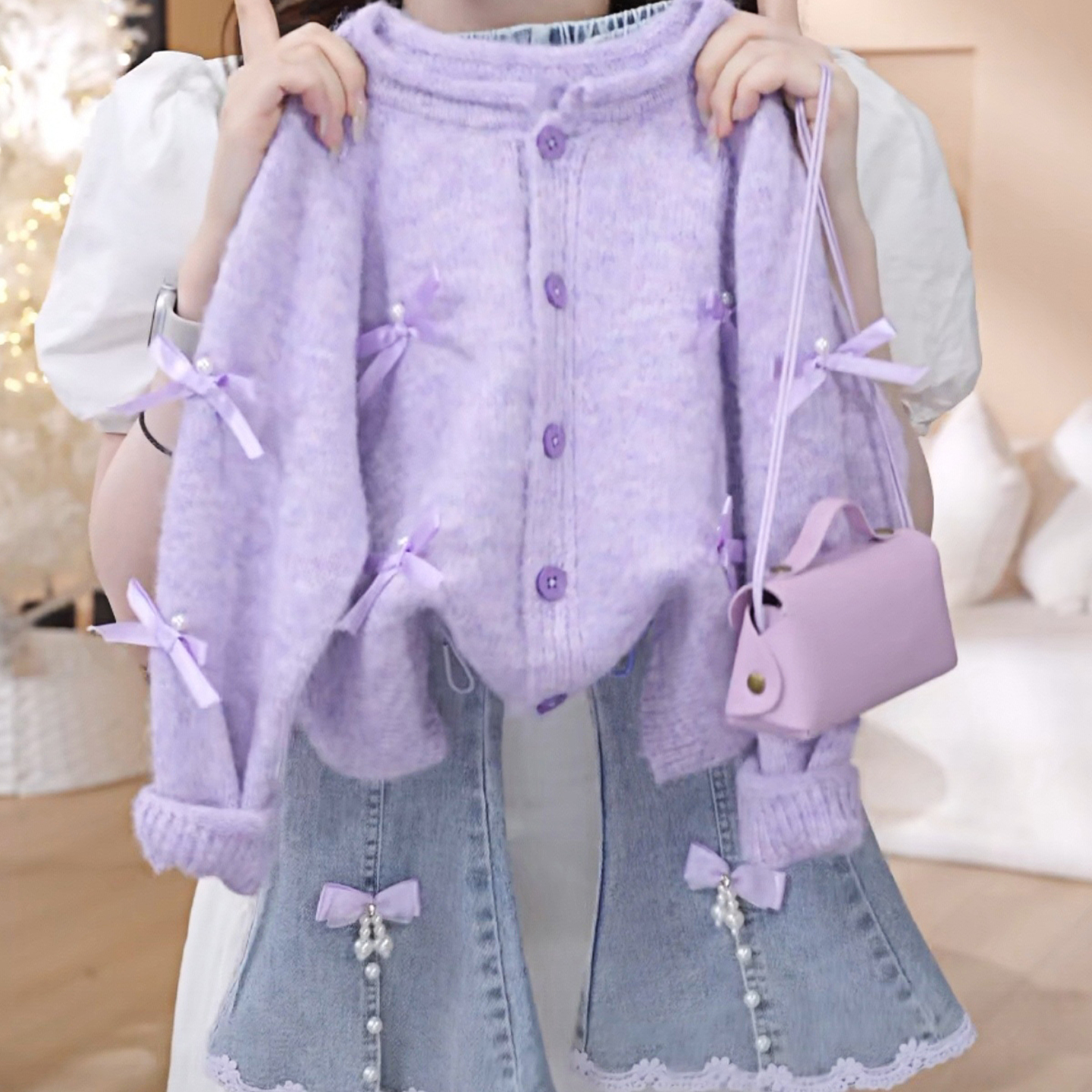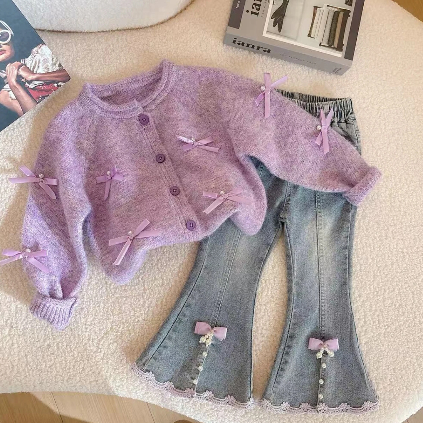 女童套装2025新款洋气儿童装宝宝春秋时尚蝴蝶结针织开衫牛仔裤潮