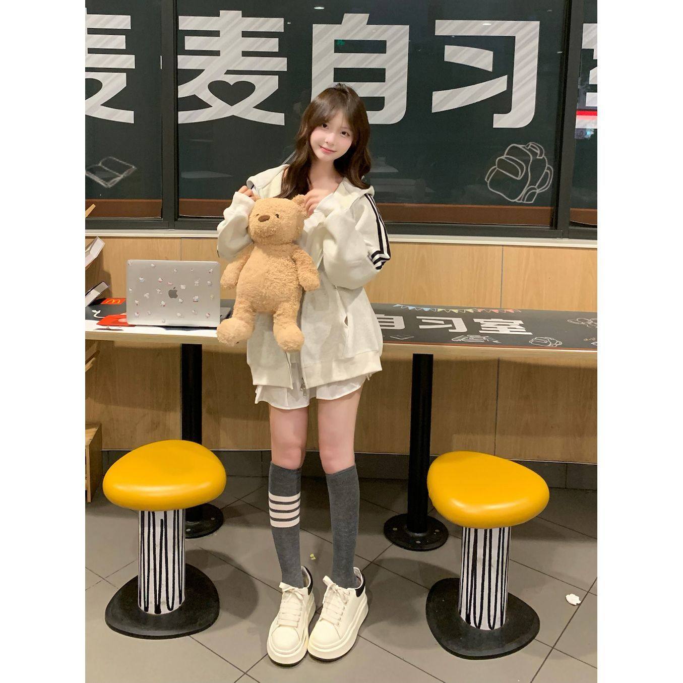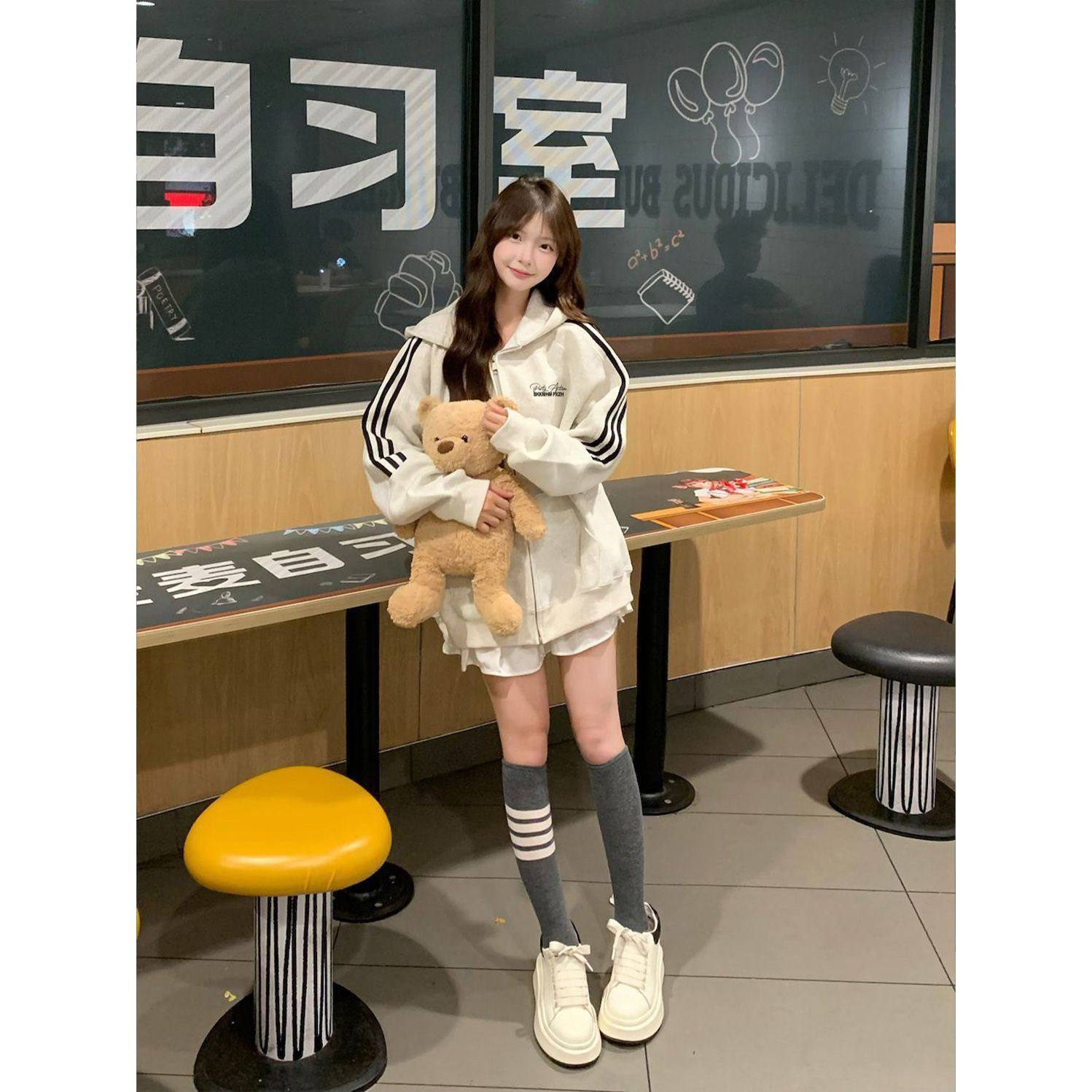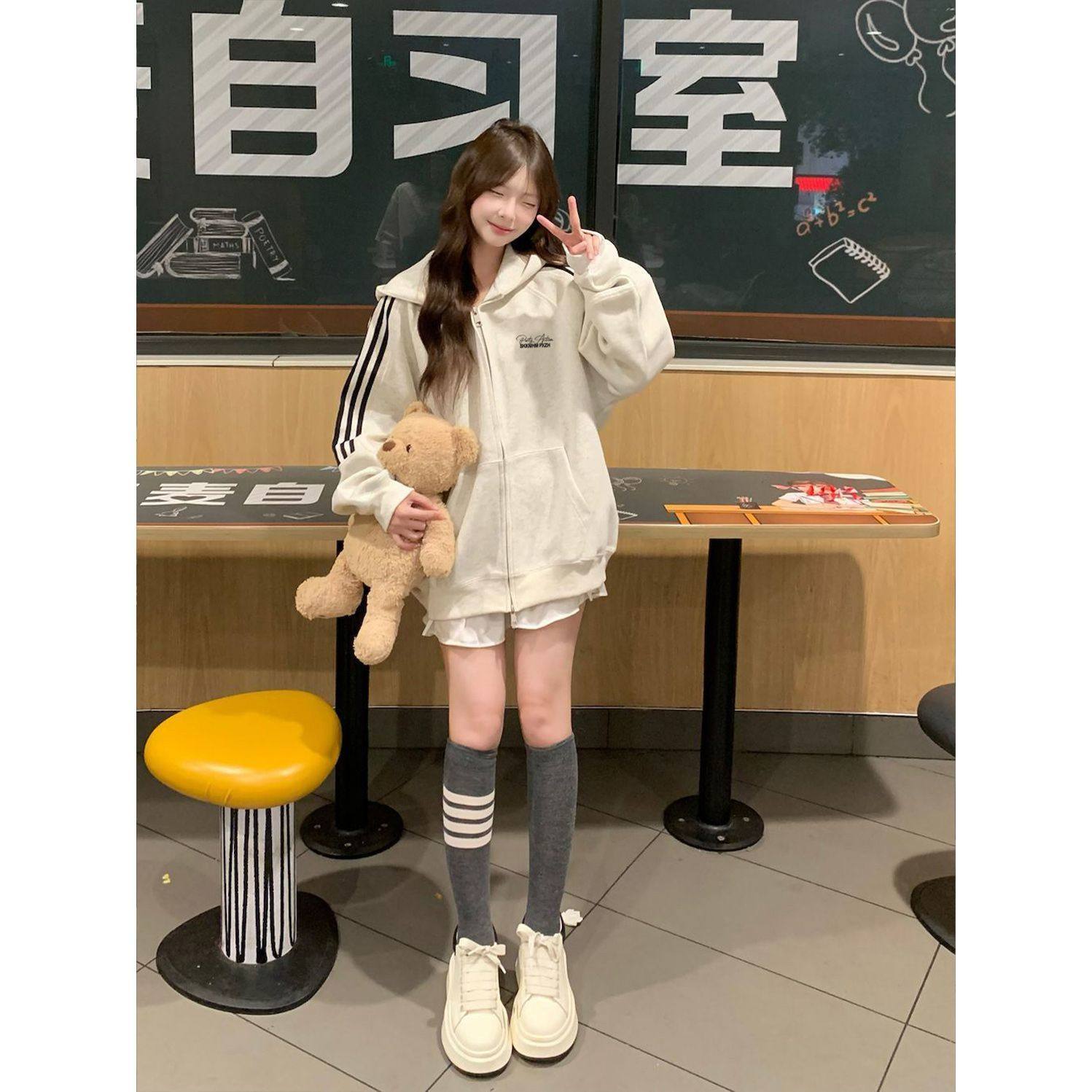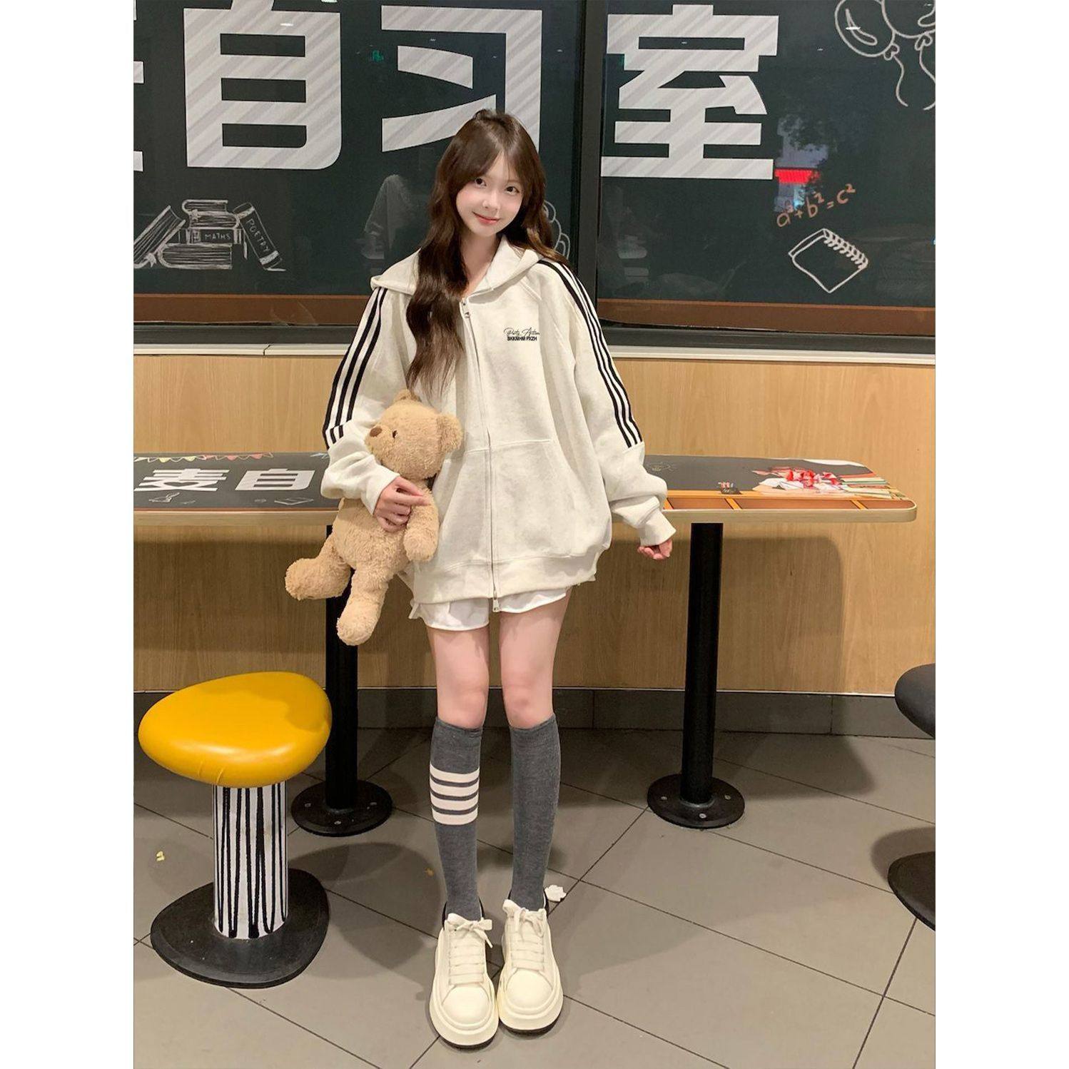重磅韩版oversize三条杆连帽卫衣女秋冬学生宽松加绒加厚开衫外套