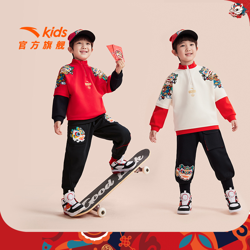安踏儿童男小童醒狮卫衣红色立领套头衫2025春季新款潮酷宝宝上衣
