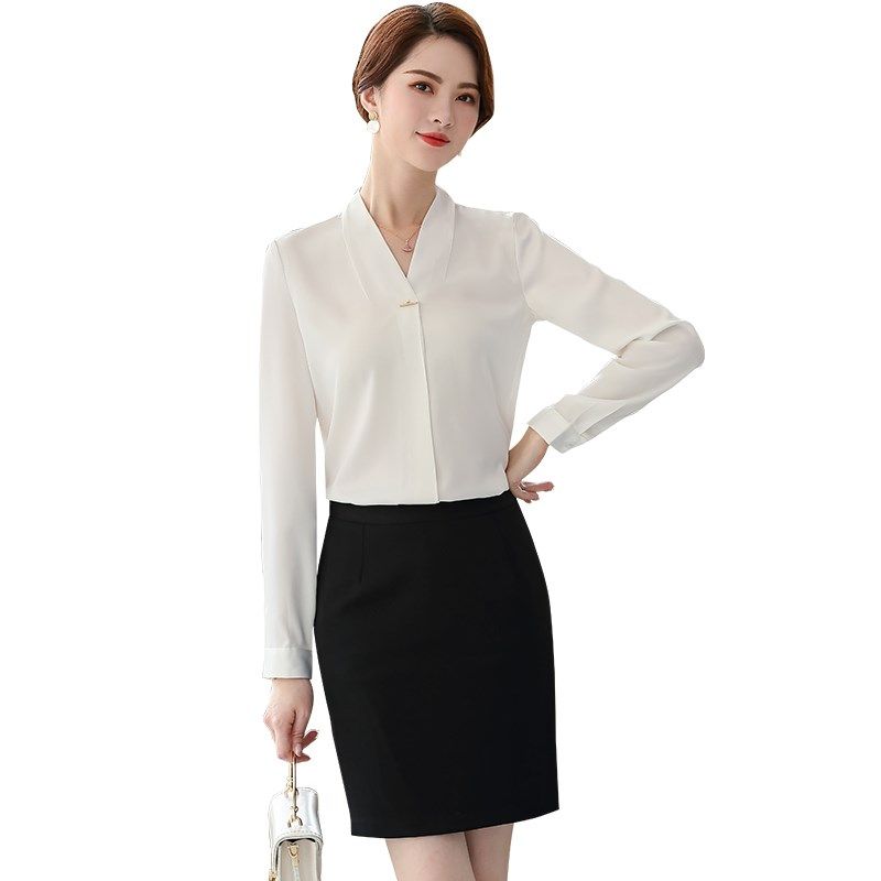 白色雪纺衬衫女秋季工作服长袖V领宽松职业上衣无领衬衣长袖套装