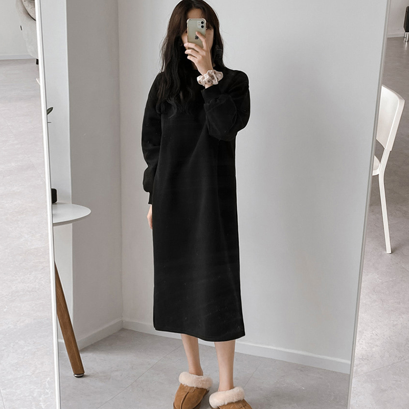 慵懒风显瘦卫衣裙女圆领冬季加绒加厚宽松显瘦遮肚气质过膝连衣裙