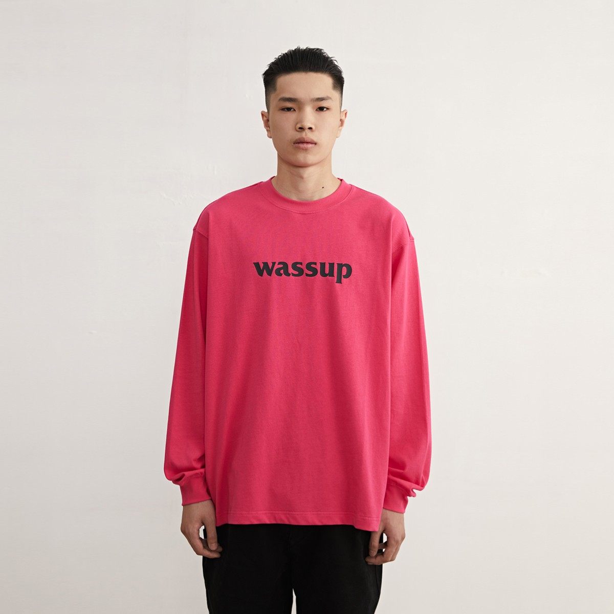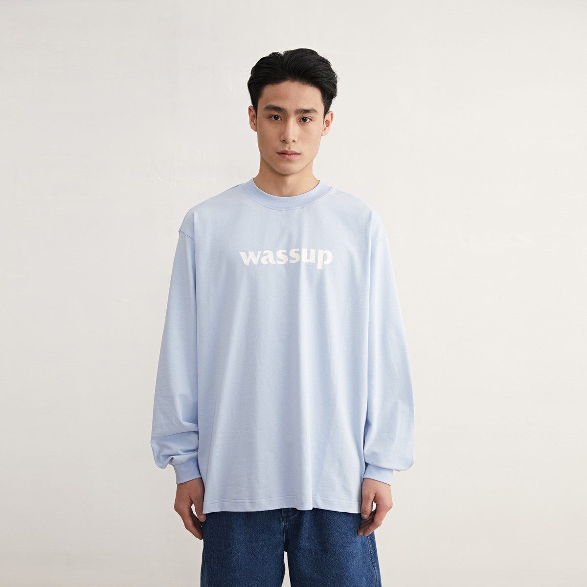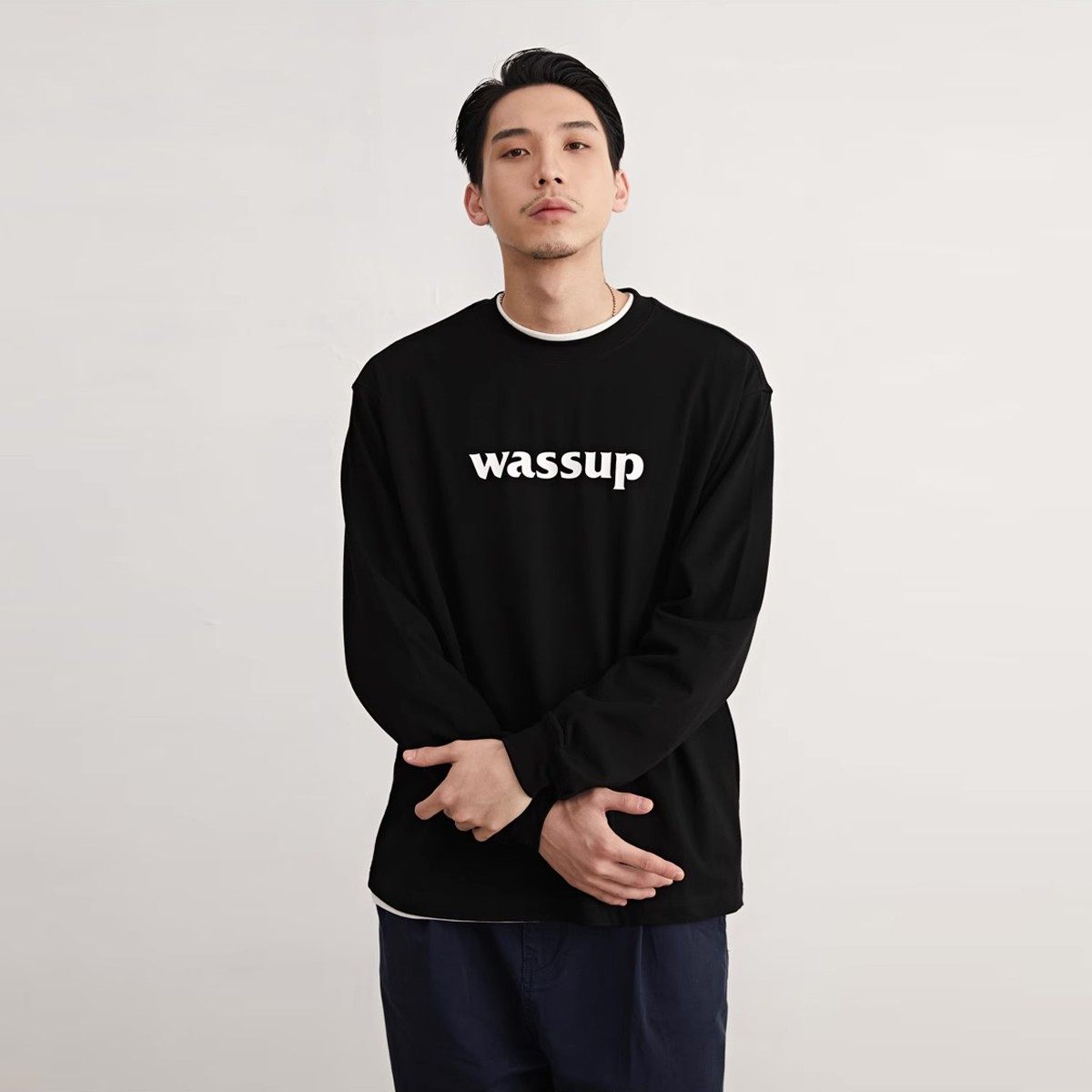 WASSUP 基础印花圆领长袖t恤男情侣打底衫简约宽松纯棉白色上衣女