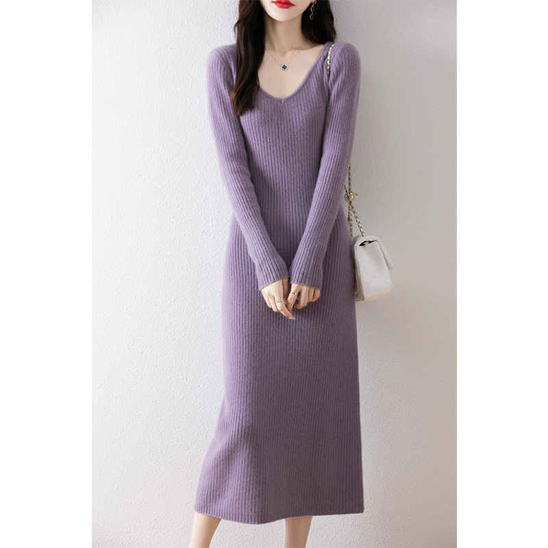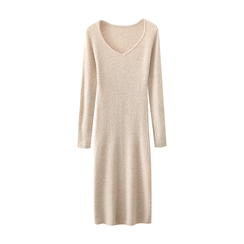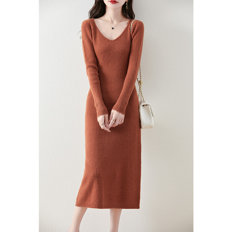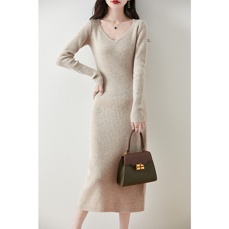秋冬新款V领连衣裙女坑条针织打底裙长款修身毛衣桃心领纯羊毛裙