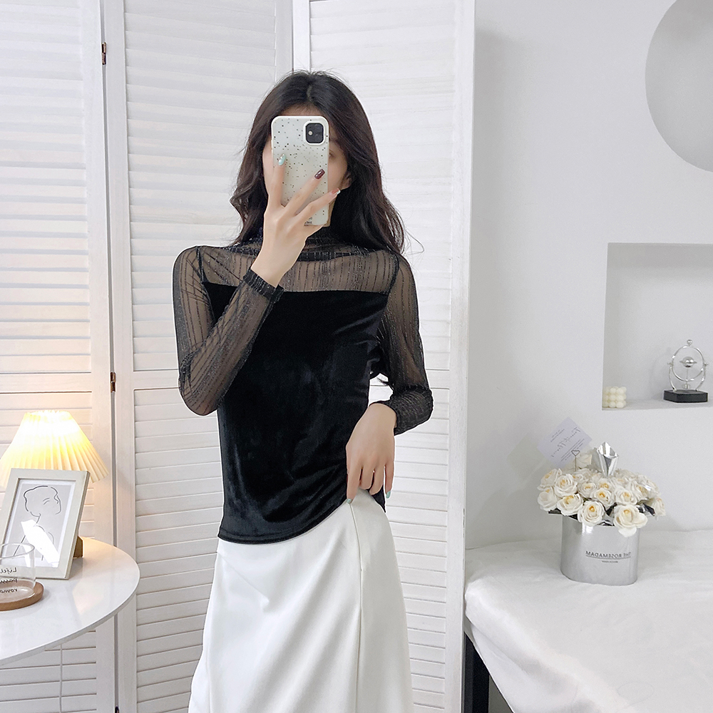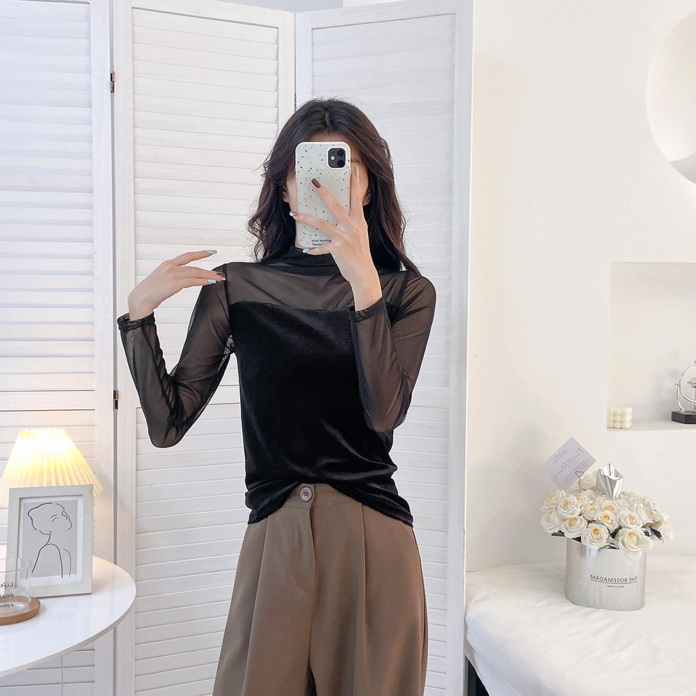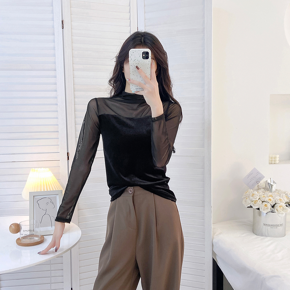 半高领蕾丝衫2025秋冬新款高级感小高领网纱拼接长袖T恤打底衫女