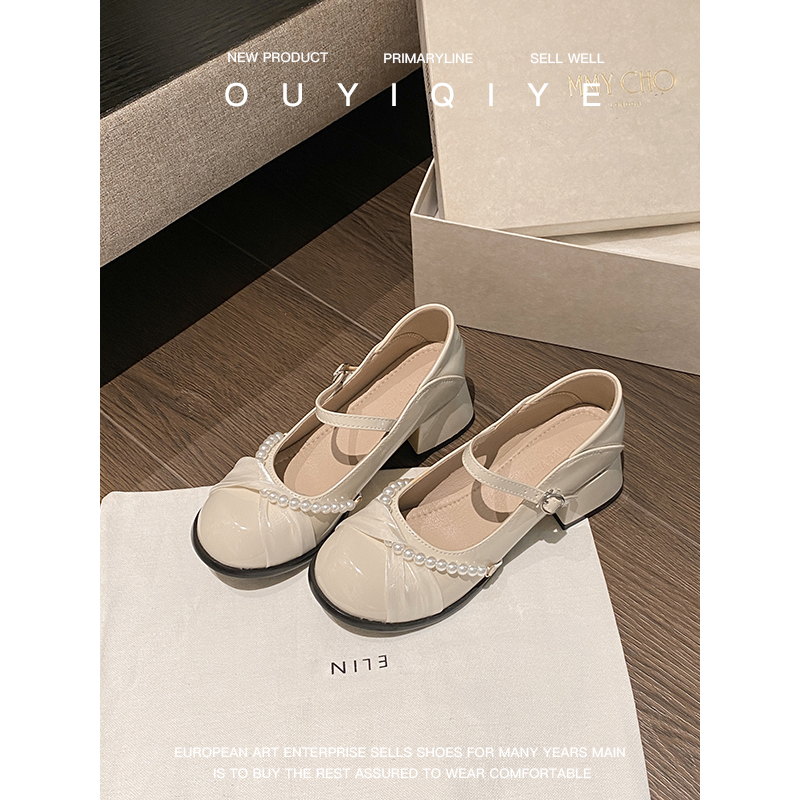 白色玛丽珍鞋伴娘鞋日常可穿浅口舒适单鞋粗跟一字带高跟鞋女春秋