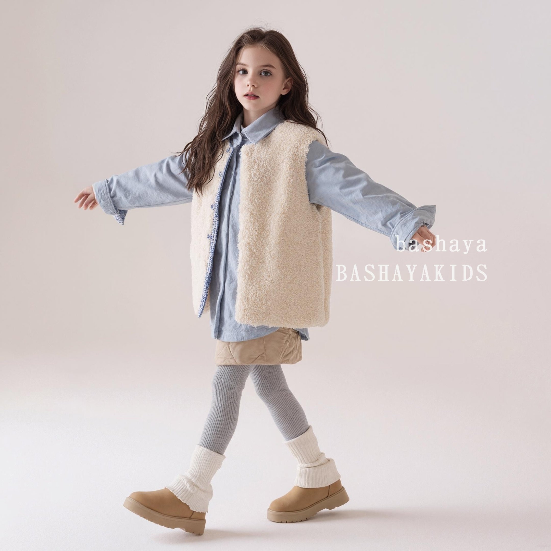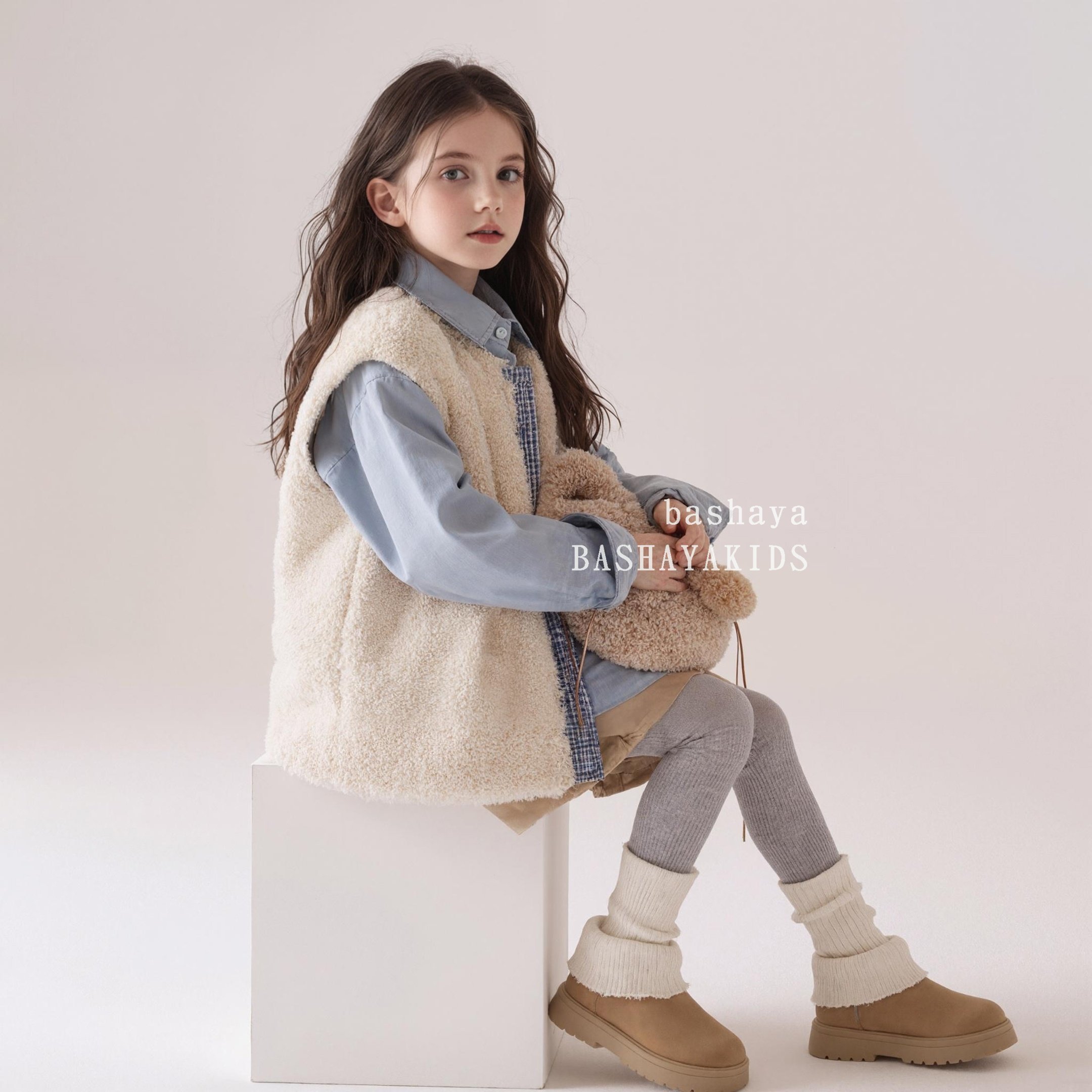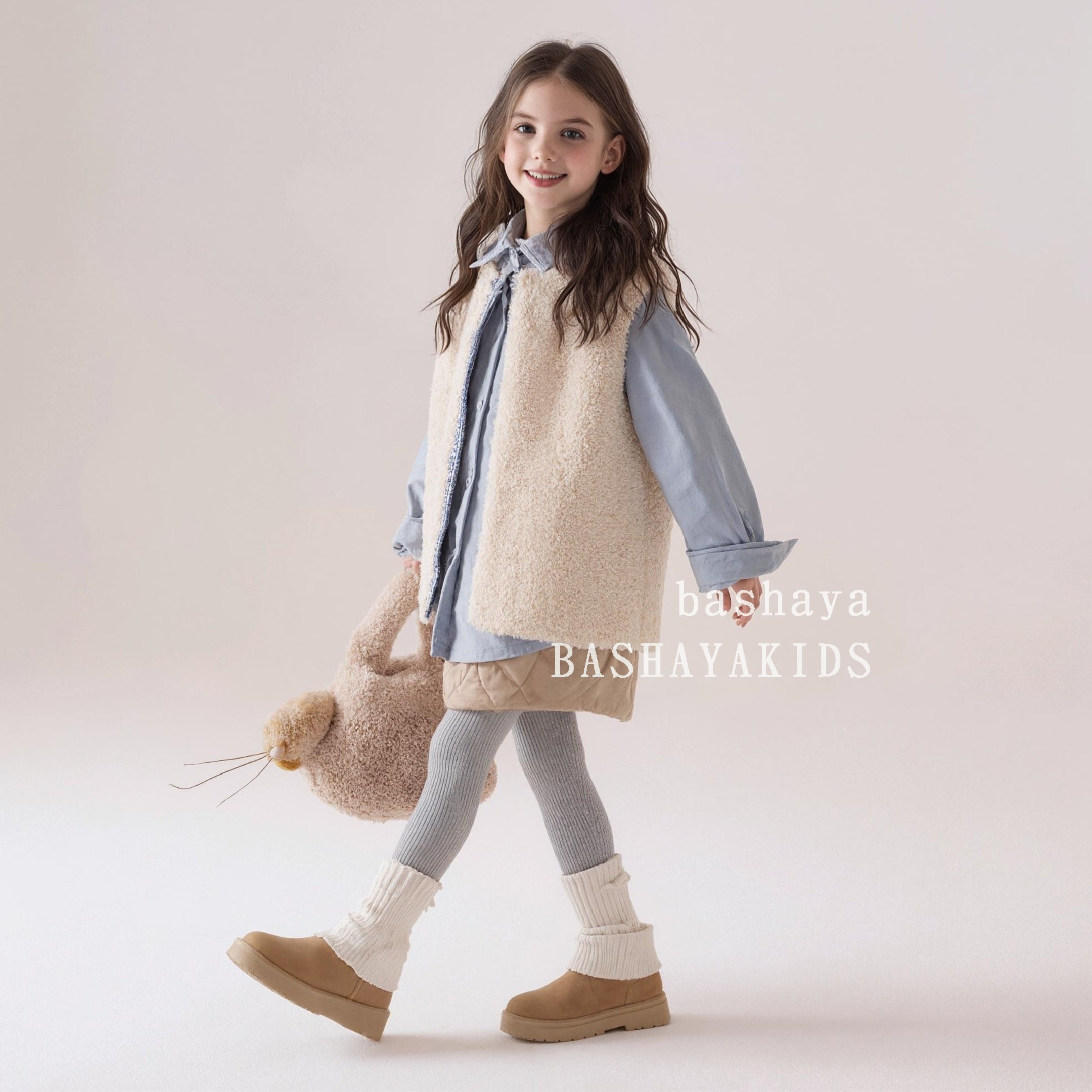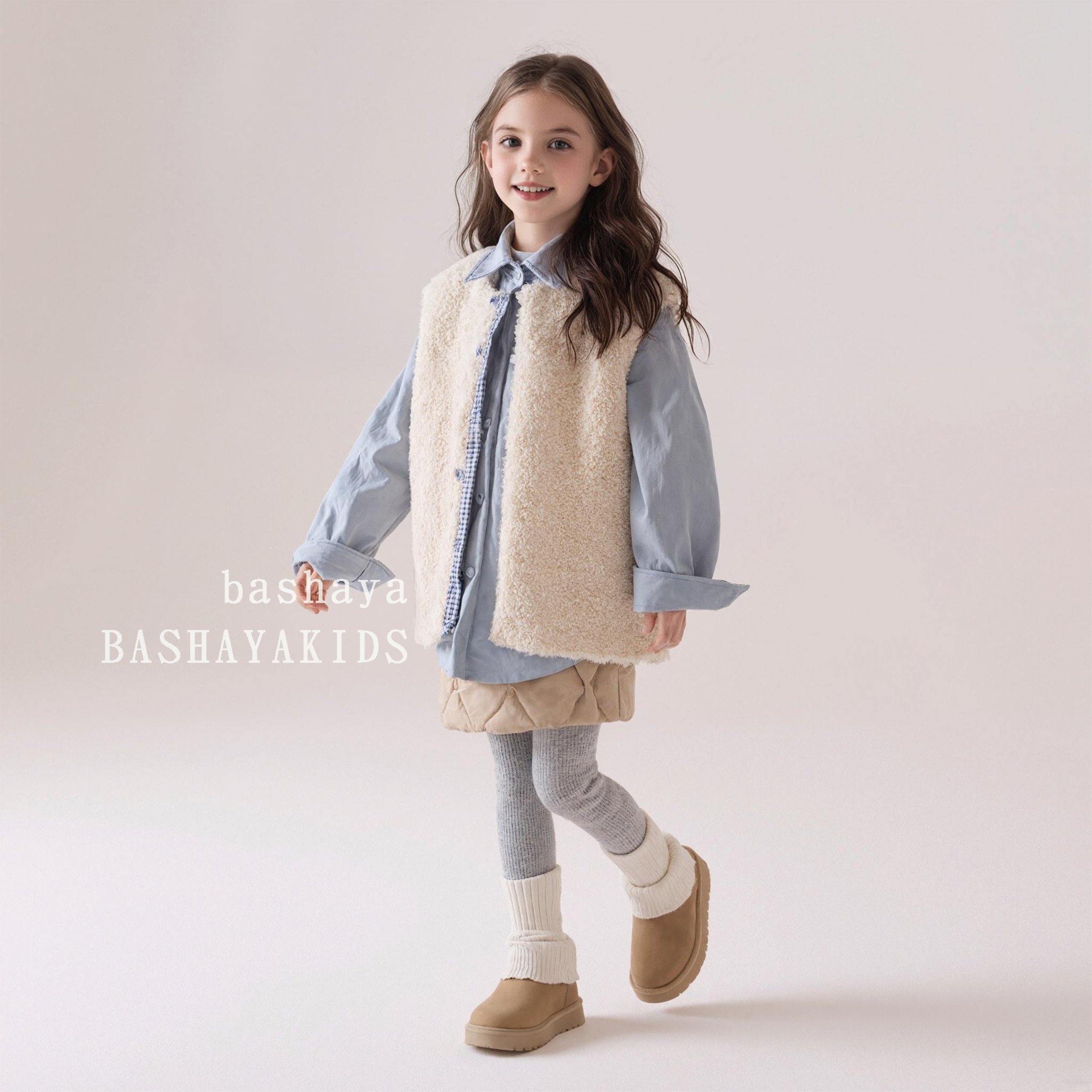 童装女童保暖背心冬夹棉外穿无袖格子拼毛毛马甲裙子大童女装冬装