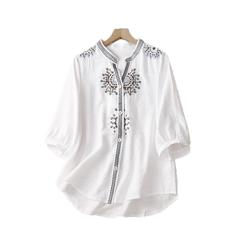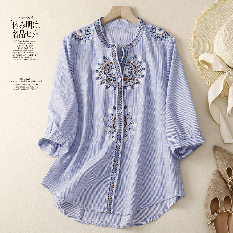 外贸意大利尾货高端女装新中式刺绣条纹七分袖衬衫立领中袖上衣夏