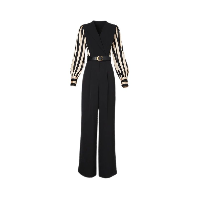 【送腰带】2025春季新款气质通勤条纹拼接高腰系带连体裤女D0522