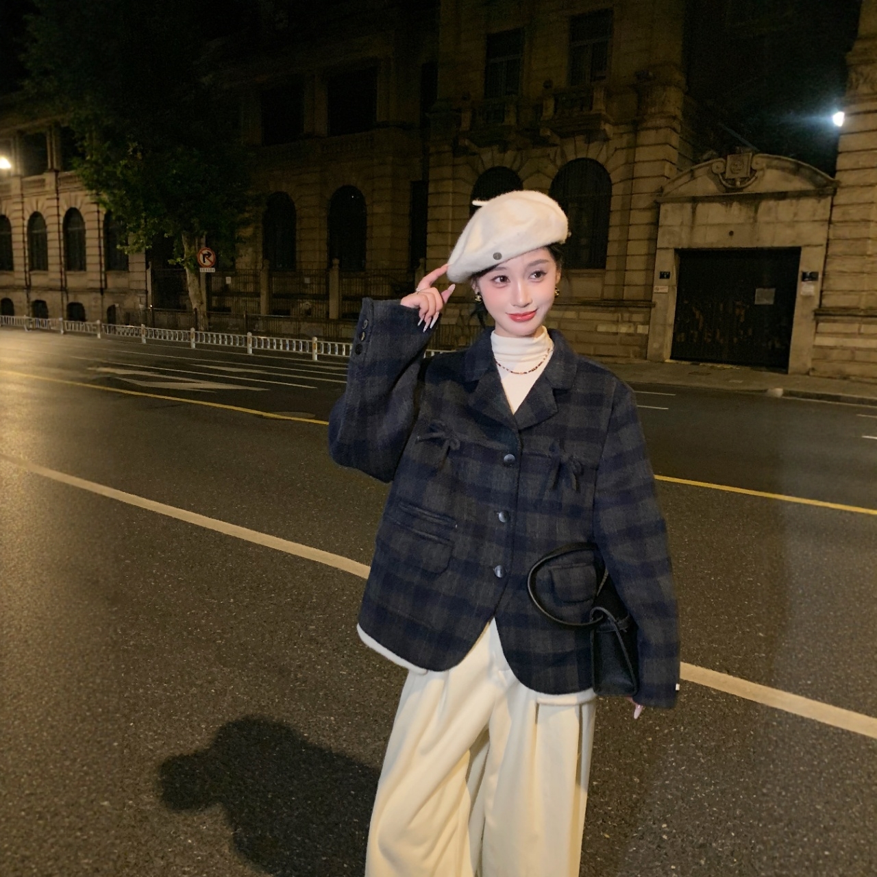 韩版甜美宽松休闲百搭西装外套2025秋季设计感蝴蝶结羊毛大衣女