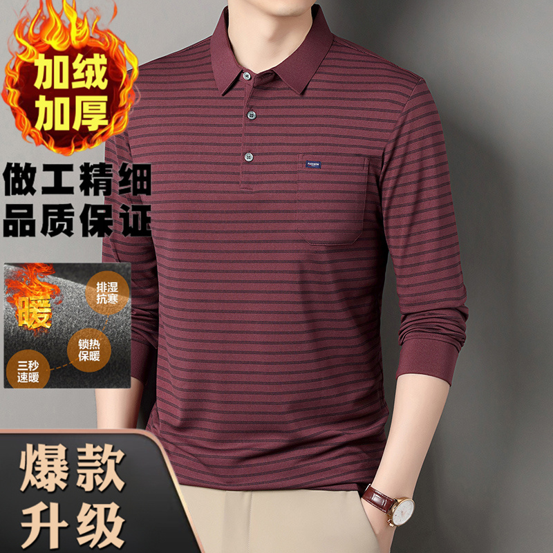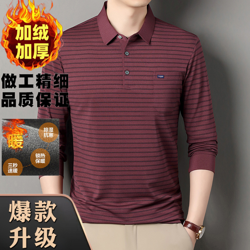 爸爸冬装加绒T恤长袖男士条纹商务休闲冬季加厚一体绒翻领打底衫