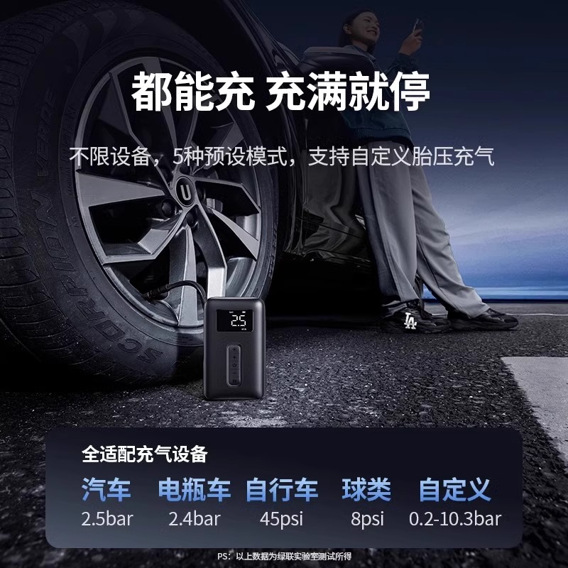 绿联车载充气泵电动打气筒打气泵汽车用测轮胎压自行车无线充气宝