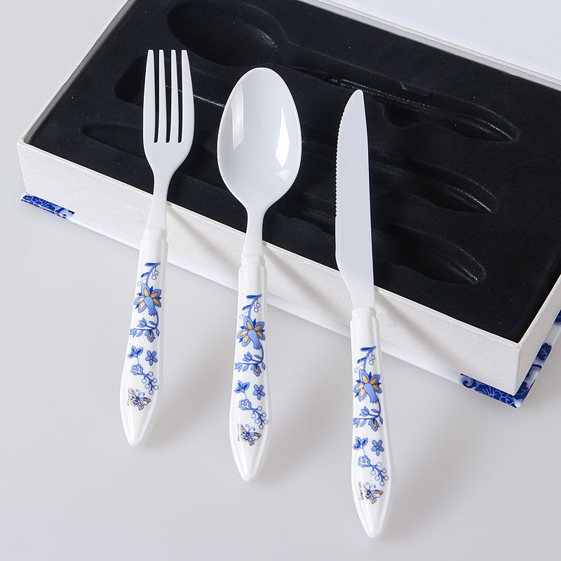 利瓷刀叉勺西餐套装陶瓷刀叉勺三件套精品陶瓷礼盒 青花瓷套装