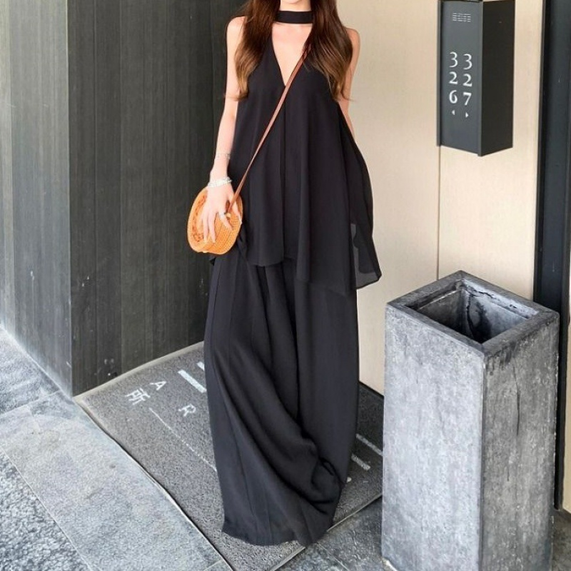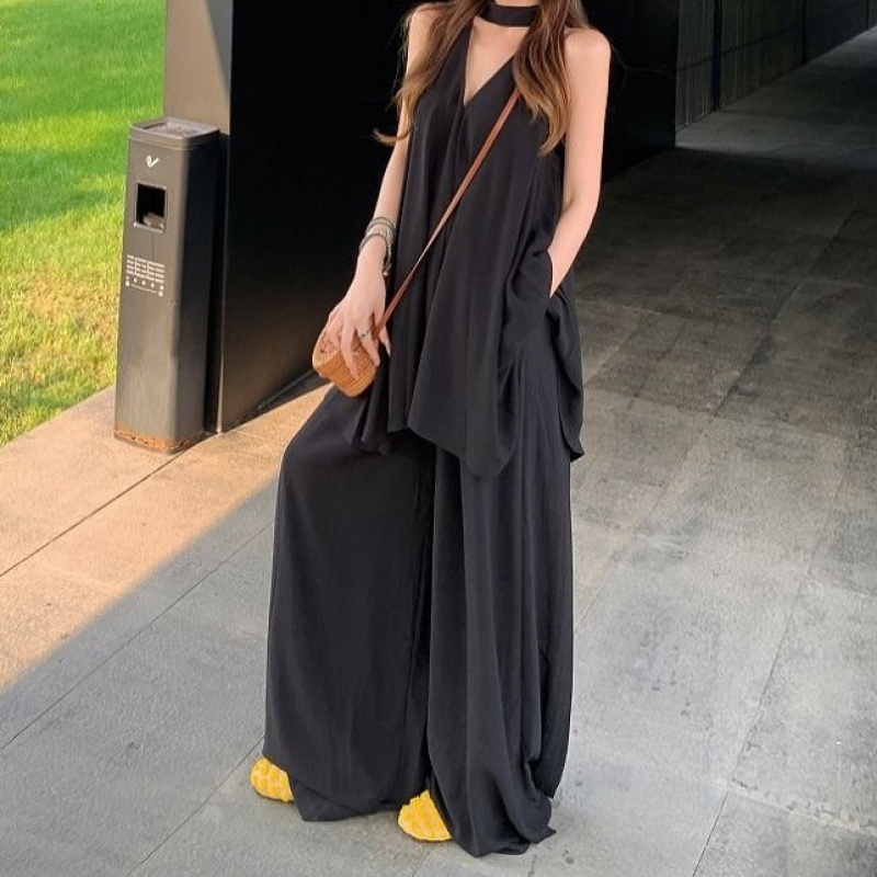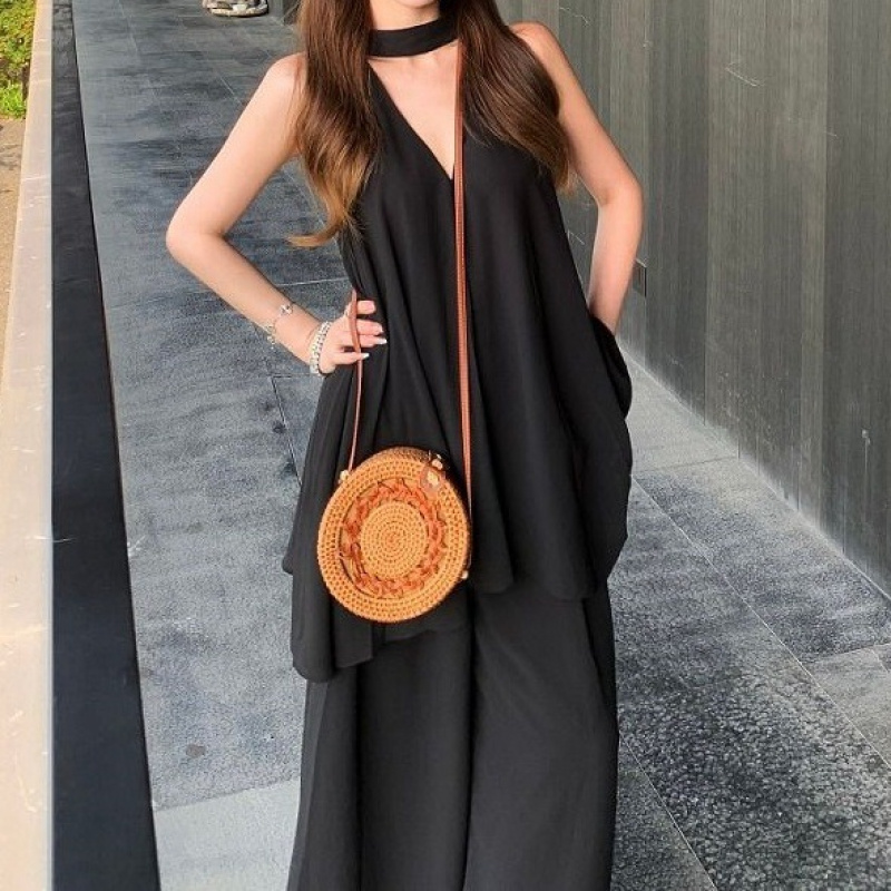 松弛感穿搭套装气质黑色v领挂脖背心女夏季休闲阔腿裤长裤两件套
