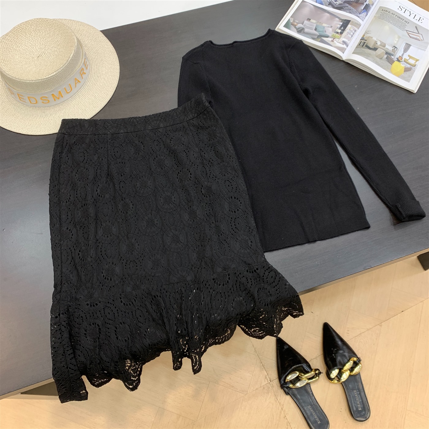 两件套秋新款简约修身百搭长袖上衣+蕾丝拼接显瘦半裙I#19