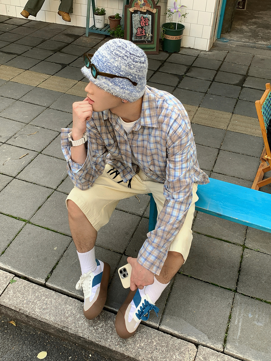 美式复古休闲衬衫晕染撞色格子衬衣外套春秋季复古宽松上衣男女