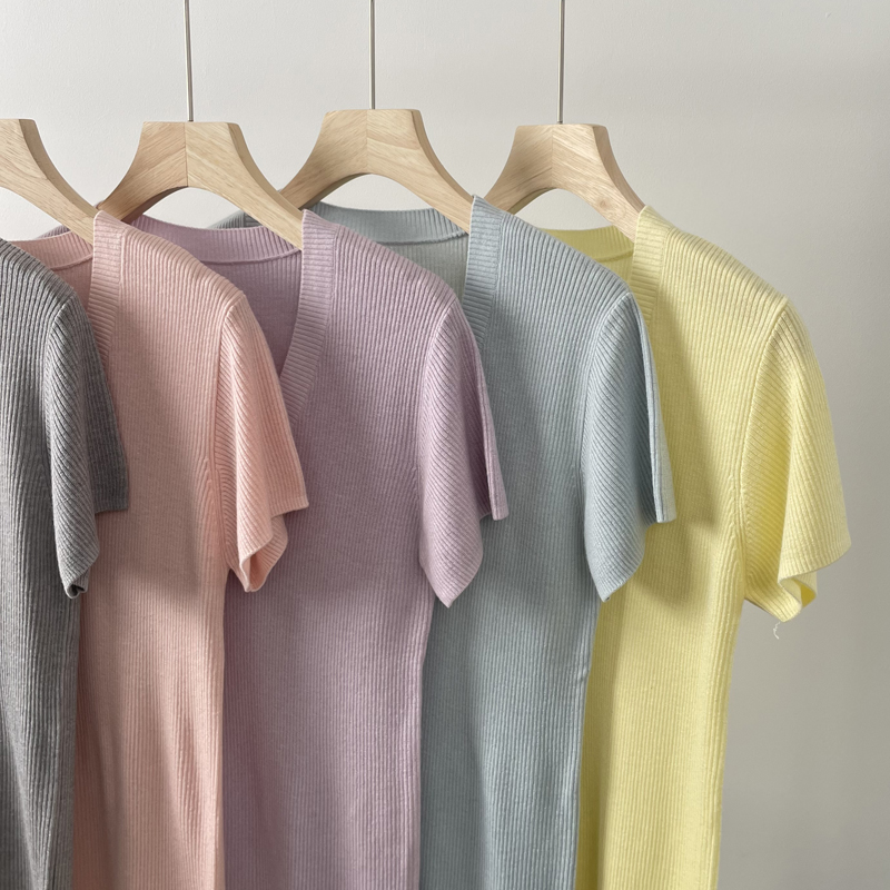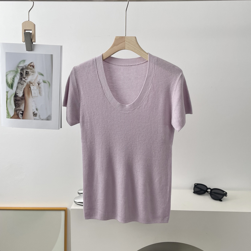 欧货U领纯色羊毛短袖针织衫 春夏季新款套头软糯显瘦打底衫上衣女
