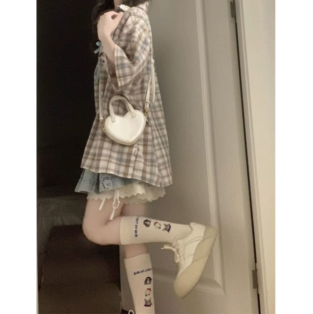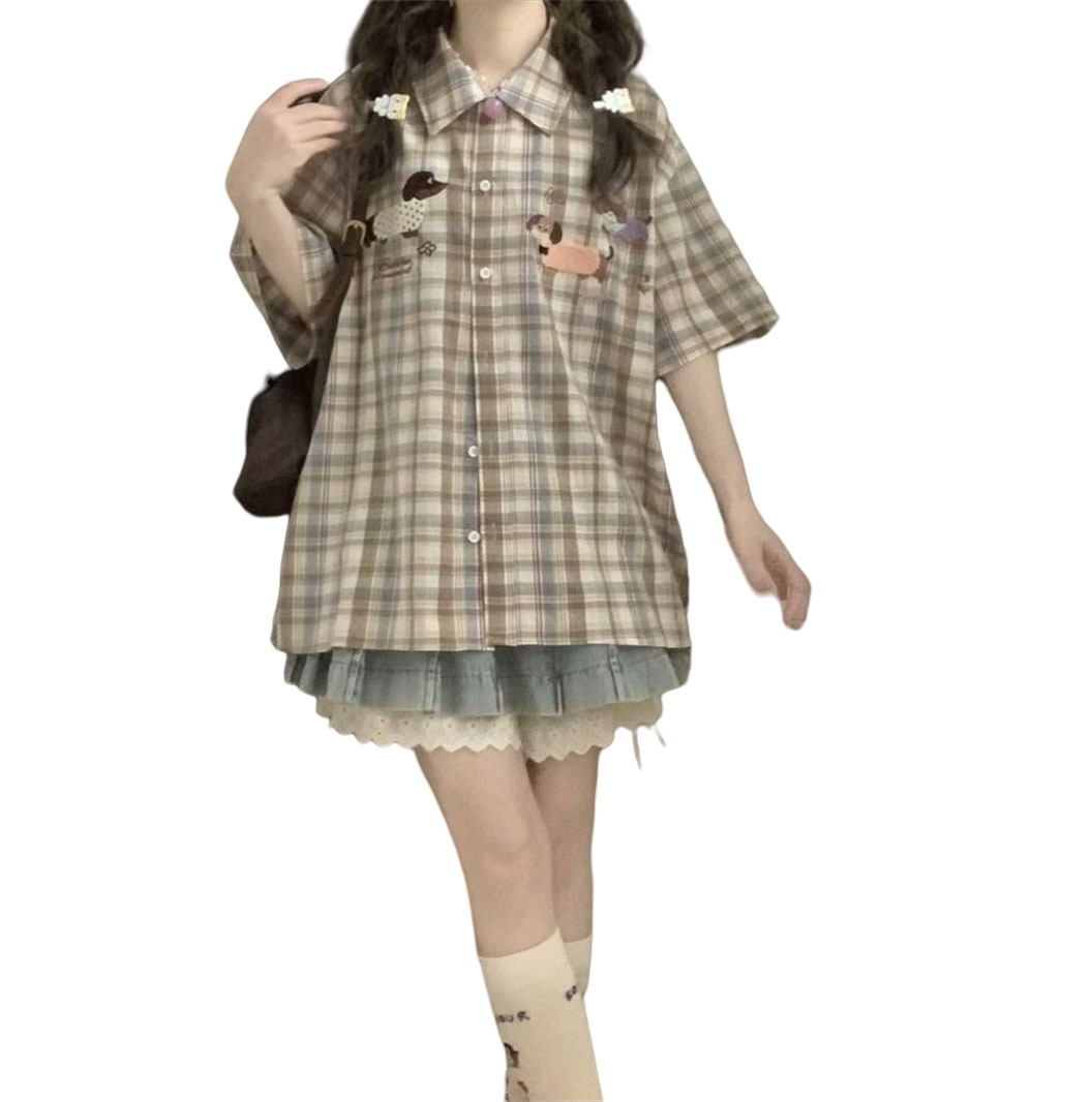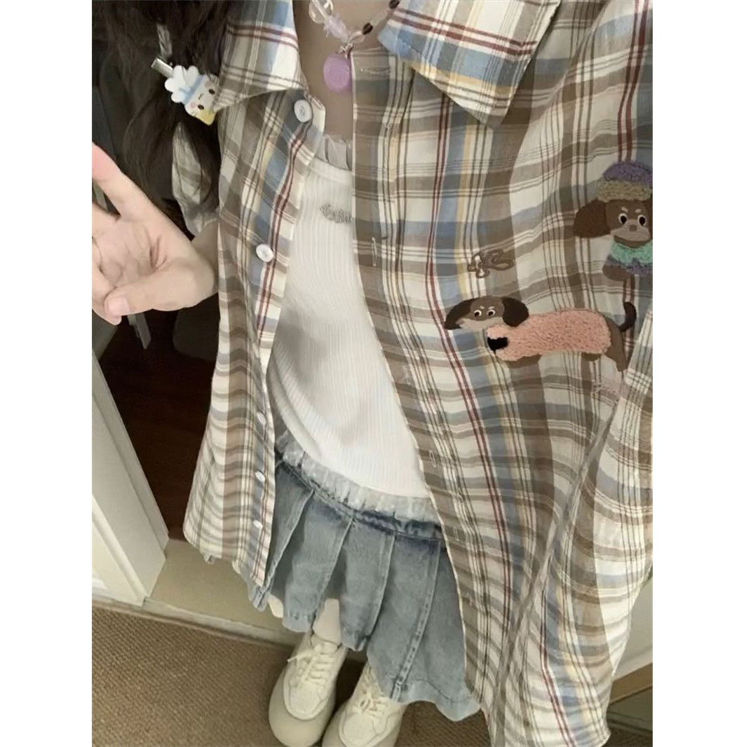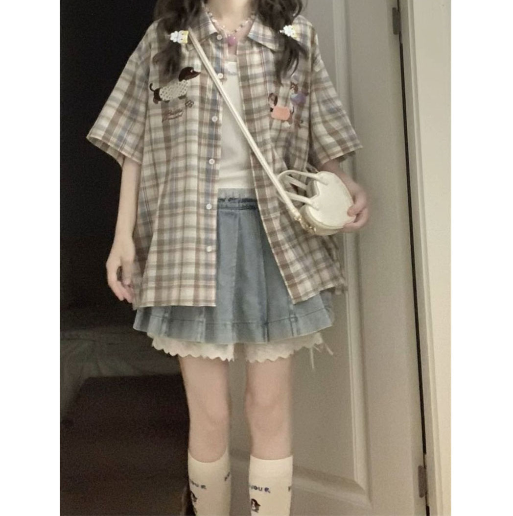 学院风卡通刺绣格纹短袖衬衫+吊带+高腰牛仔半身短裙子女三件套装
