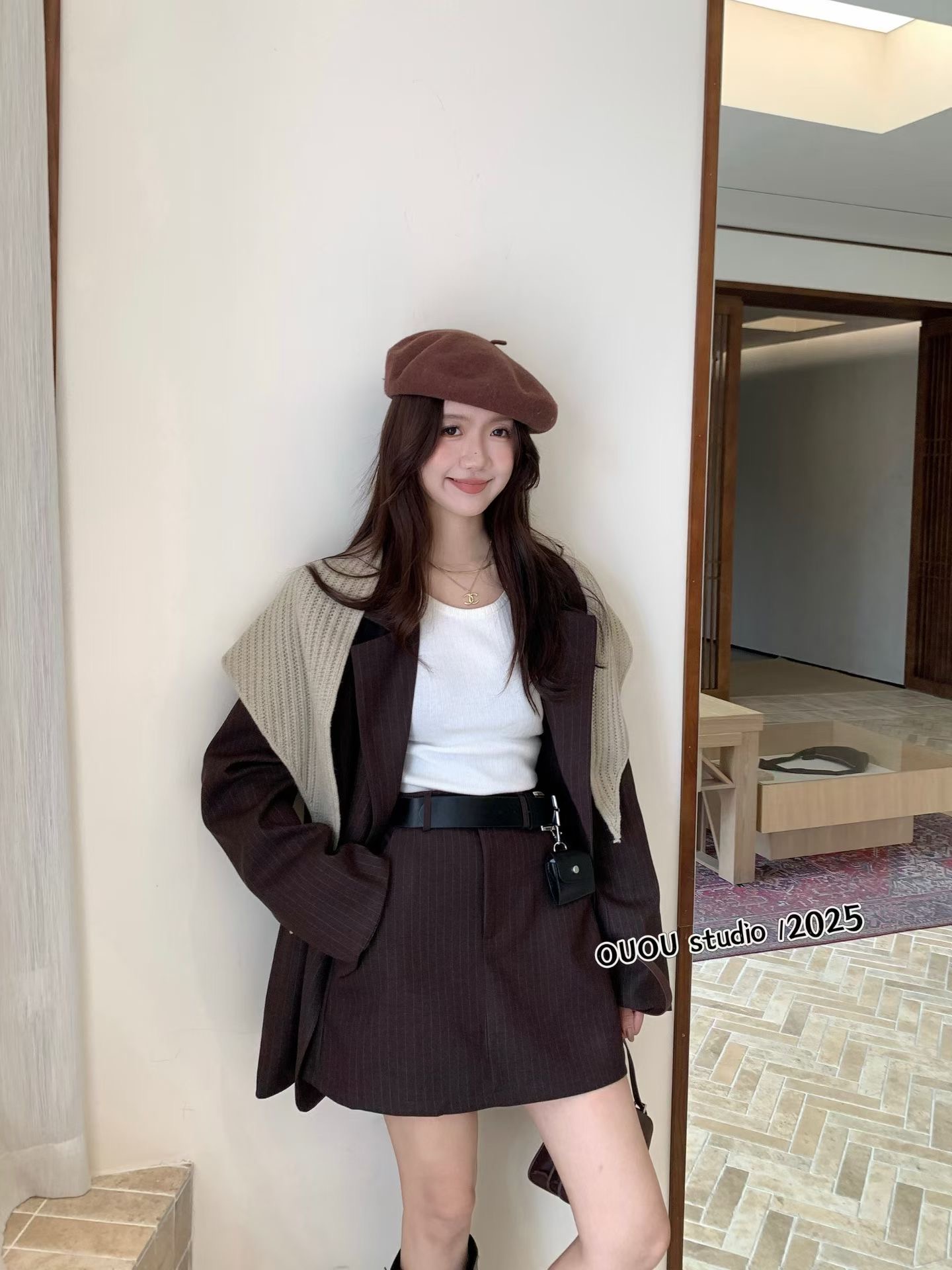 OUOU秋冬2025新款高级感针织披肩条纹外套高腰半身裙配腰带四件套