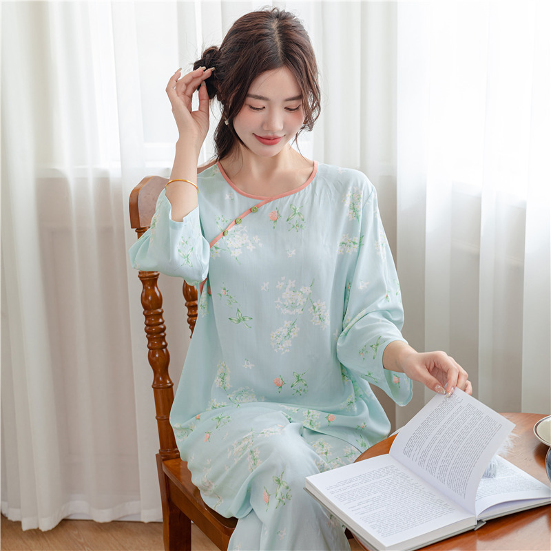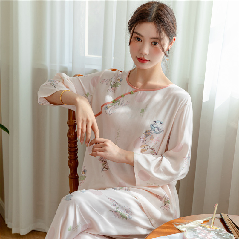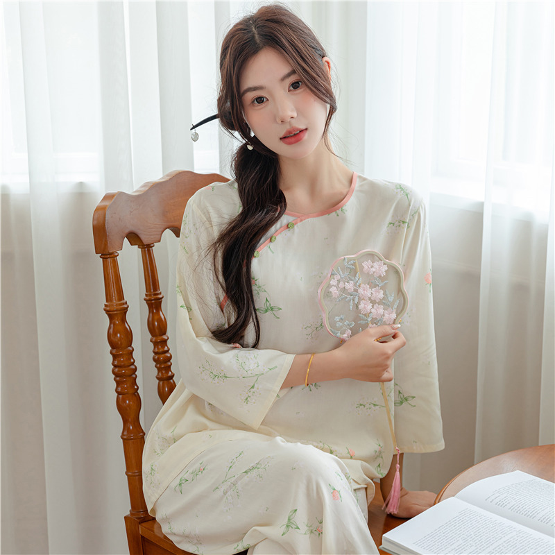 夏季中国风棉绸睡衣女薄款春秋新中式古风气质长袖绵绸家居服套装
