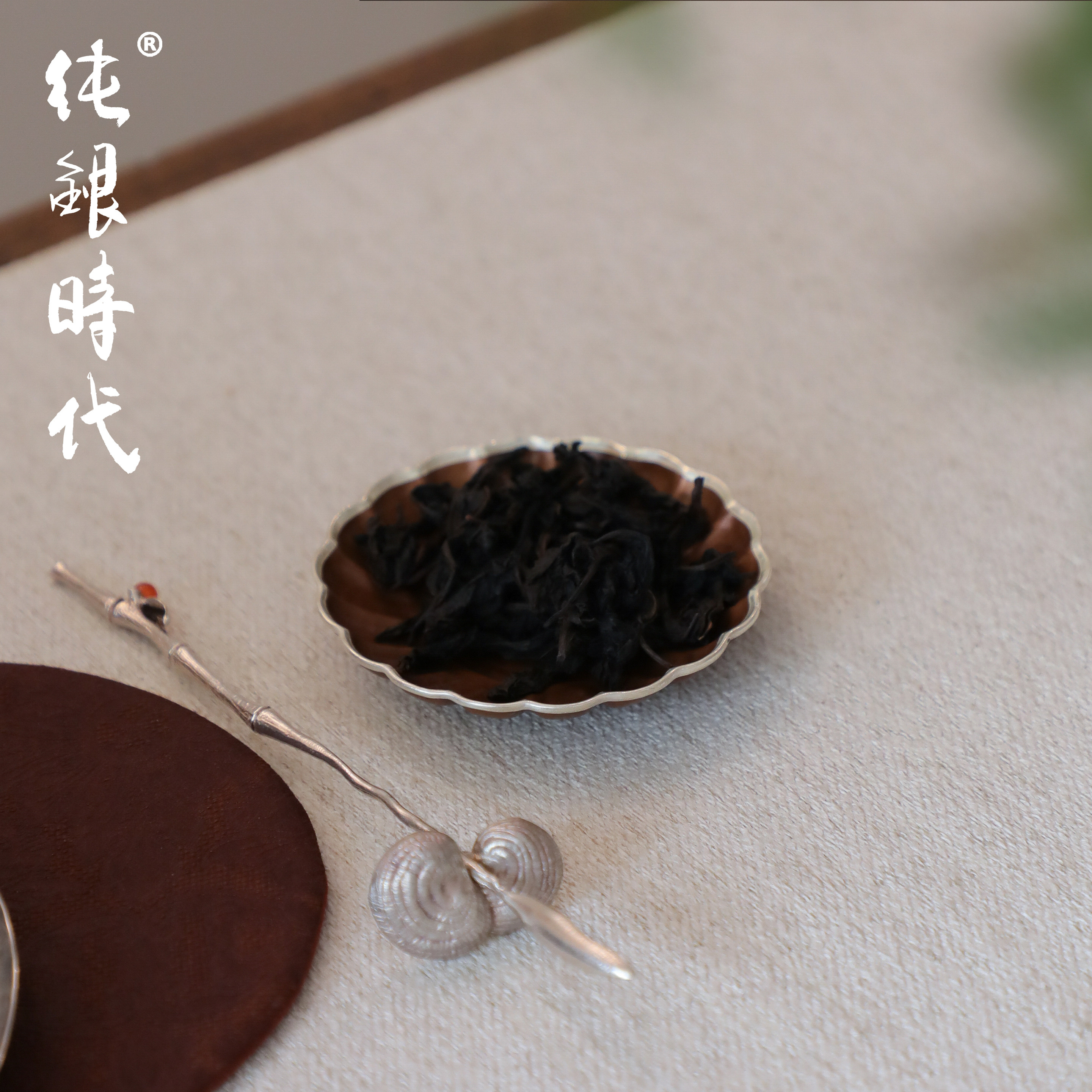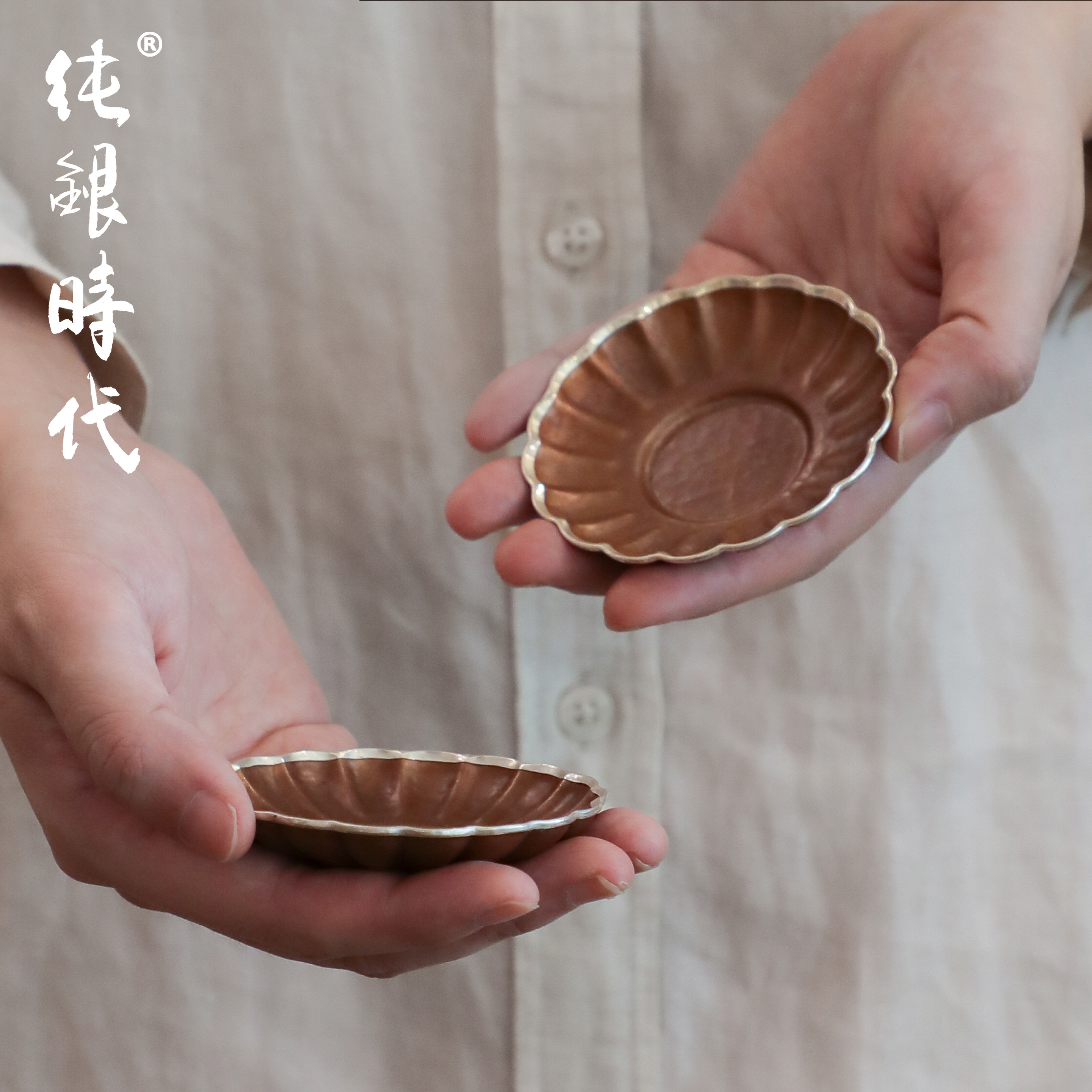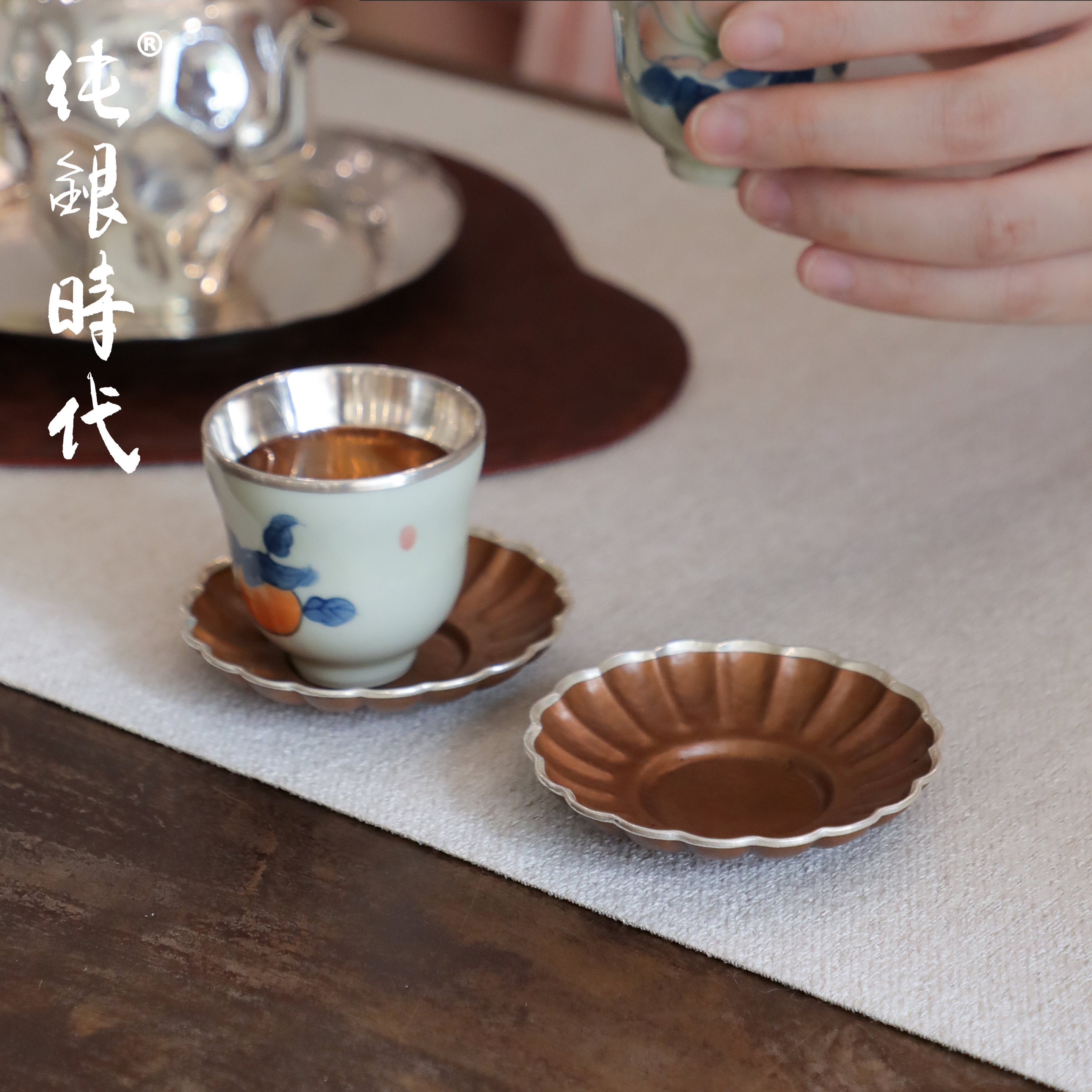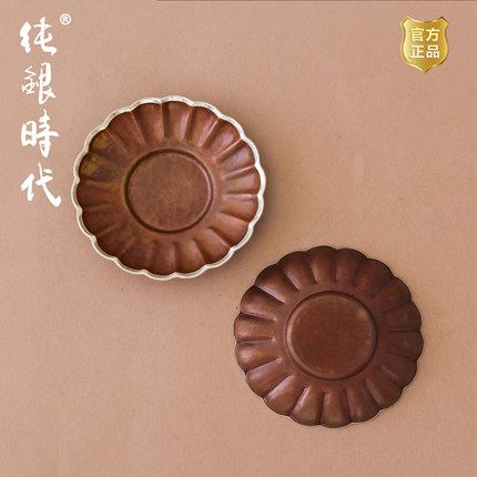 纯银时代包银边菊瓣紫铜茶托杯托简约手工隔热小杯盘小巧便携茶具