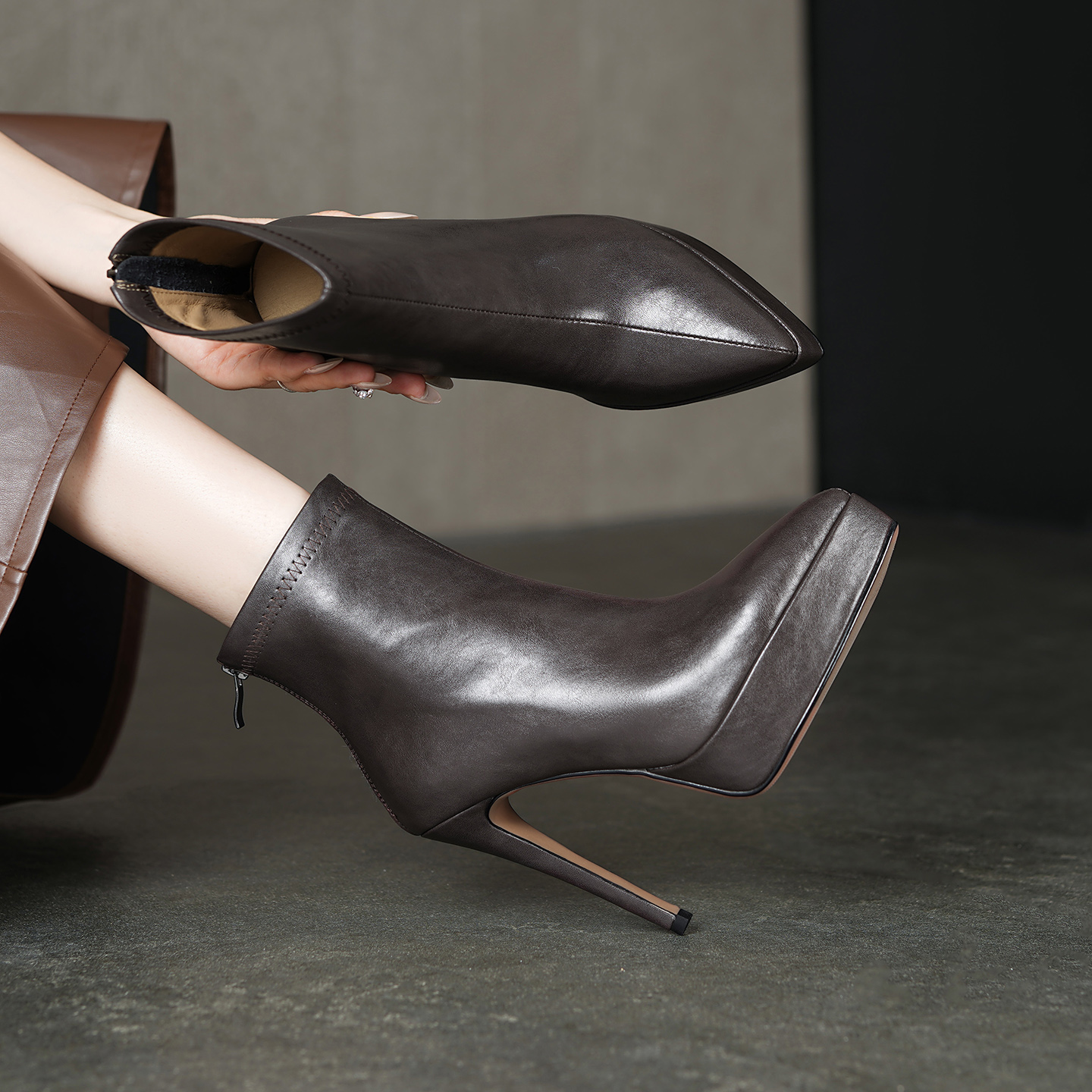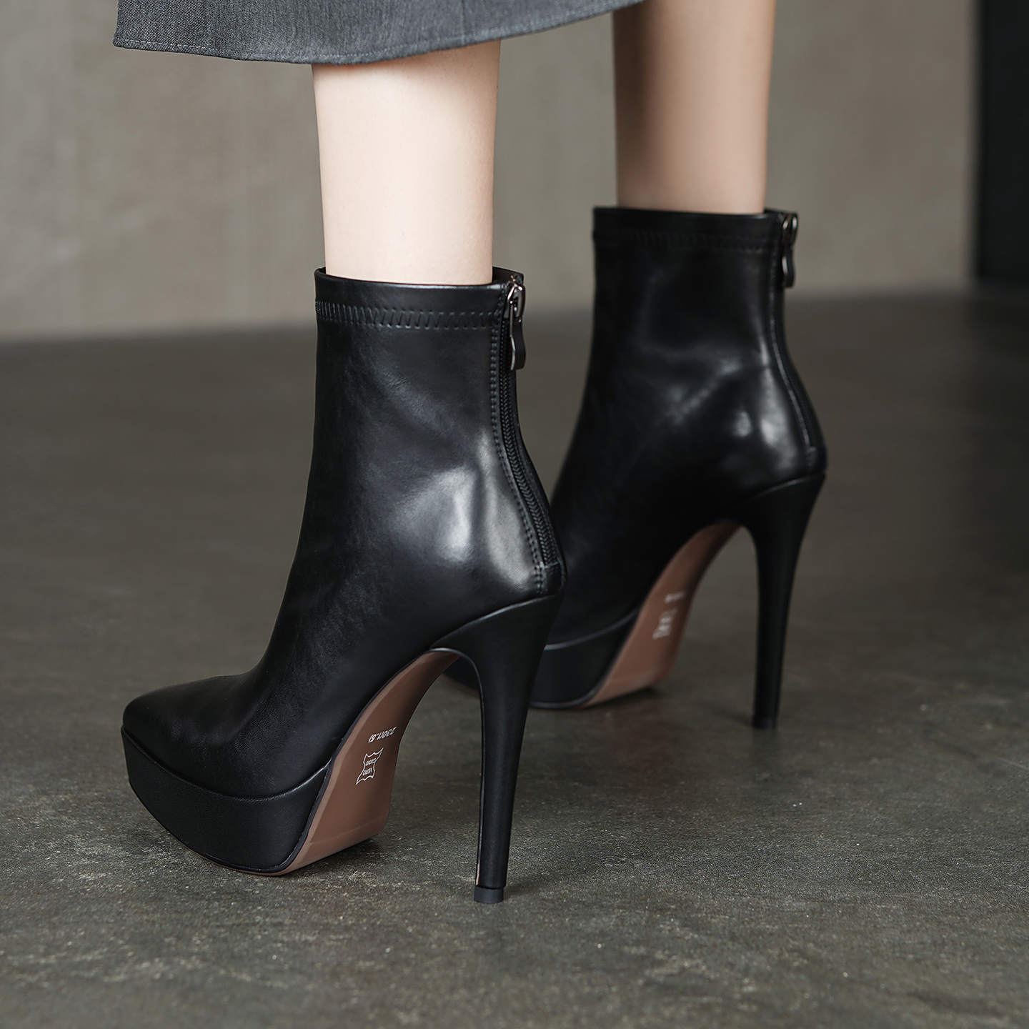 头层牛皮超高跟尖头细跟防水台高跟鞋真皮黑色法式简约高级感短靴
