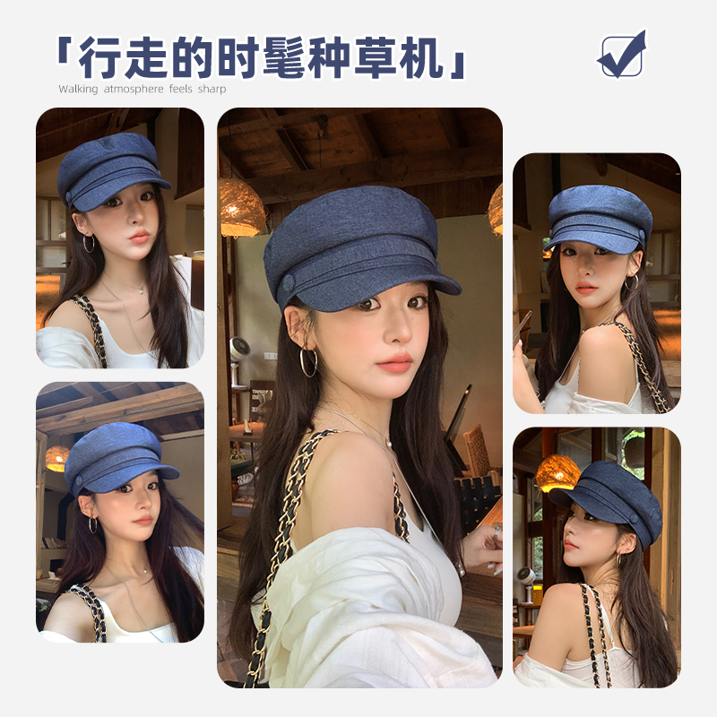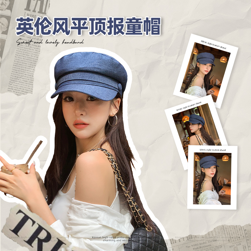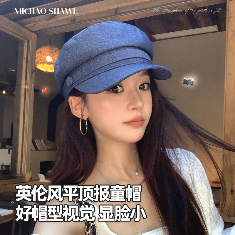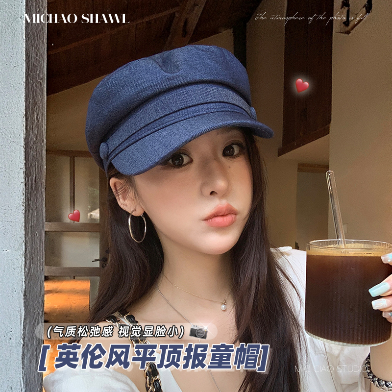 复古牛仔贝雷帽女春秋薄显脸小平顶帽子画家帽2025新款鸭舌报童帽