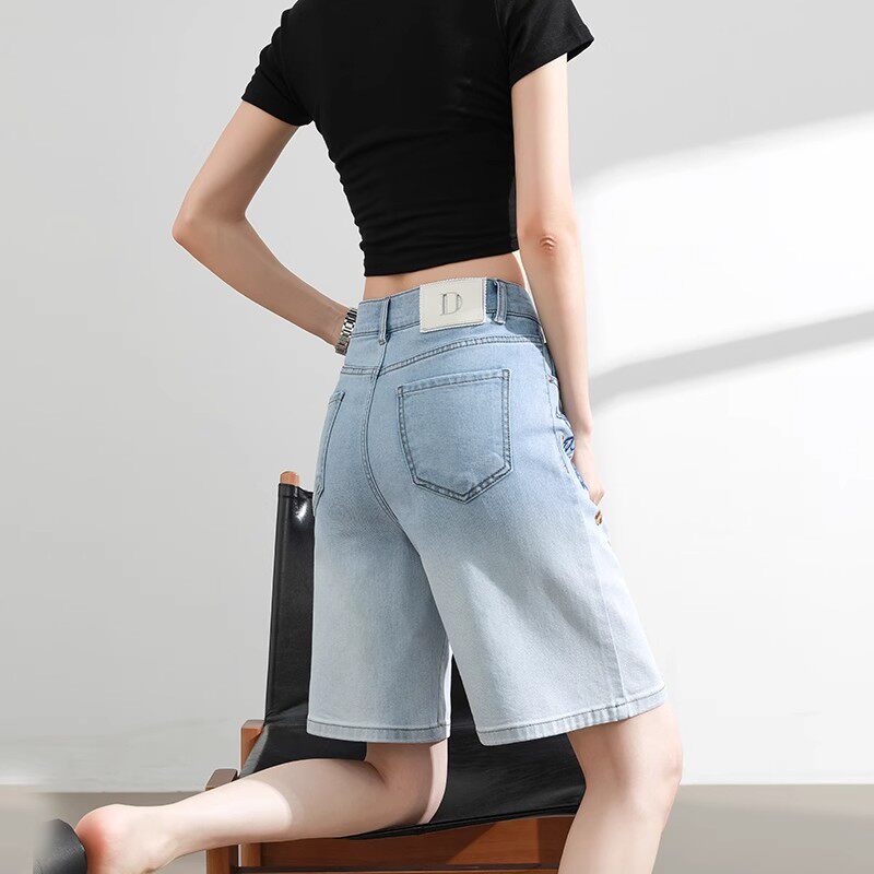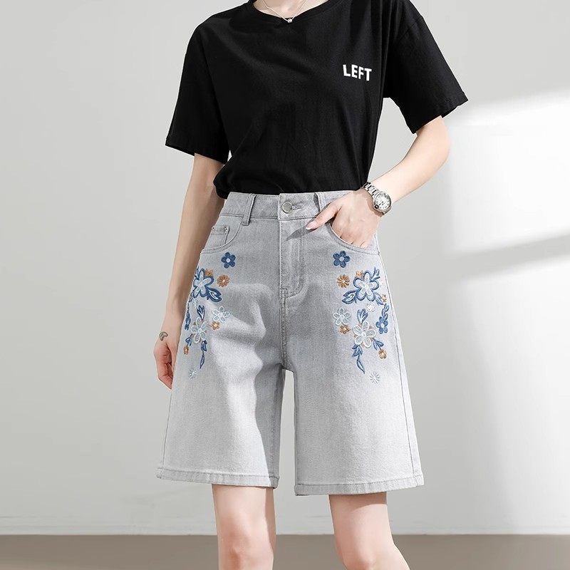 绣花薄款刺绣2025牛仔短裤女新款宽松夏季直筒五分裤高腰显瘦中裤