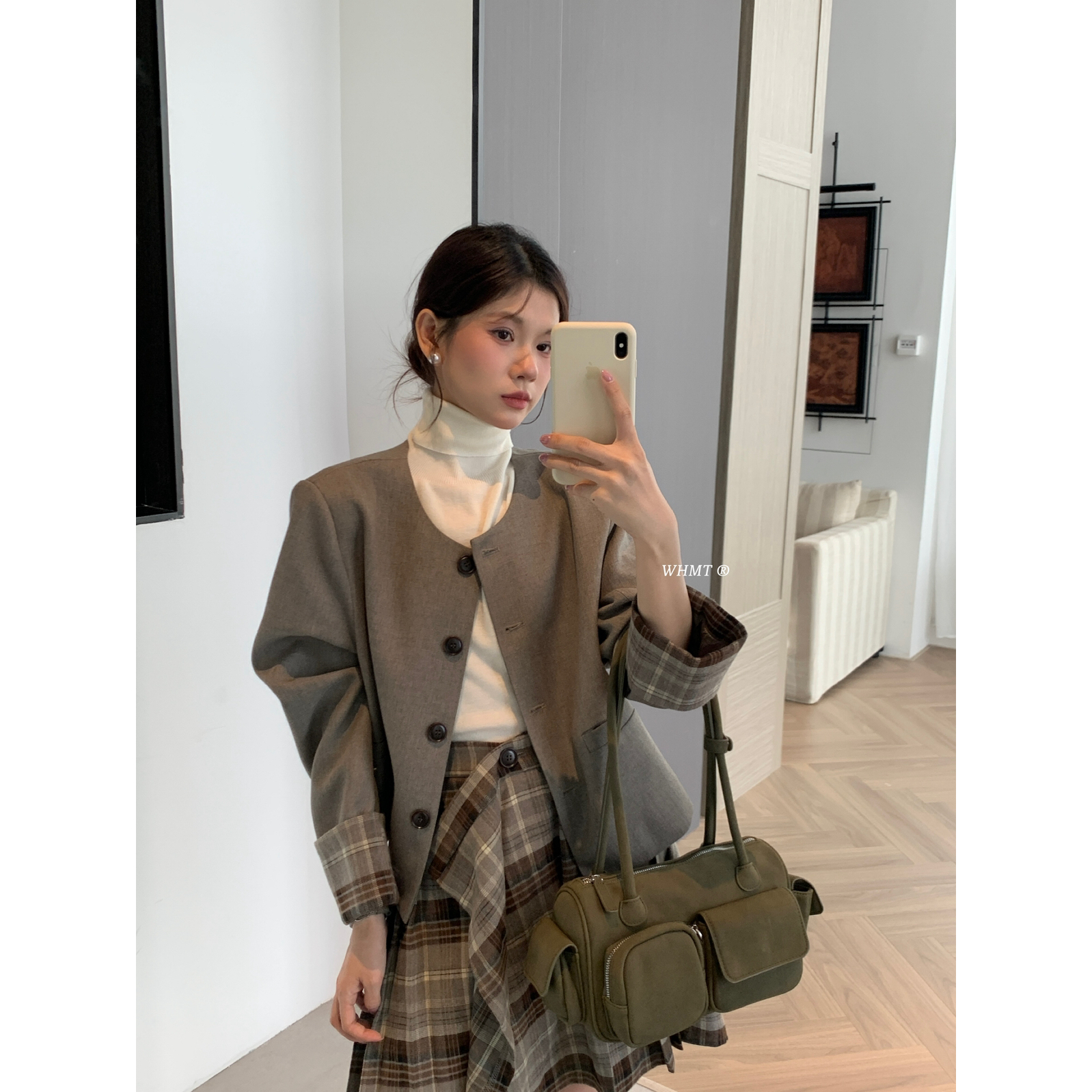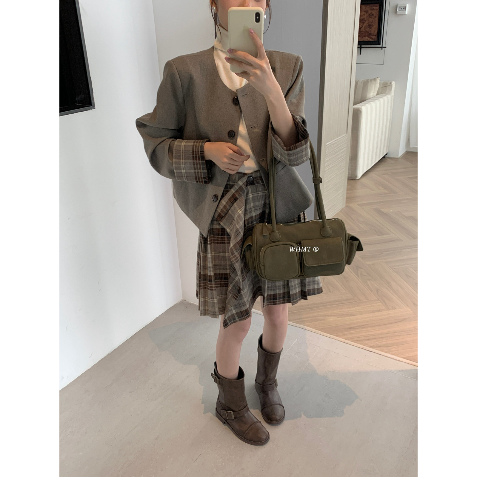 RS.WHMT-圆领拼接格纹短外套+格纹百褶半身裙套装(含3羊毛Q1308