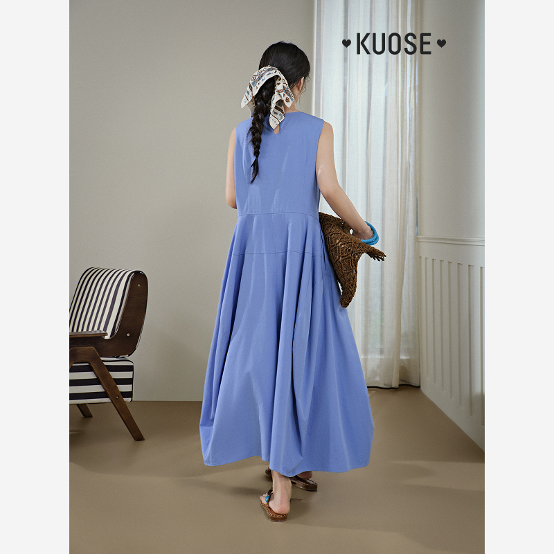 阔色蓝色无袖背心大摆连衣裙女2025夏季新款法式休闲通勤长裙子
