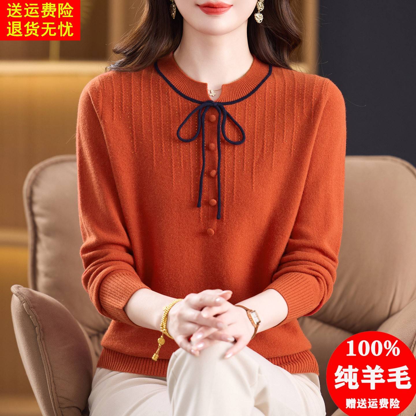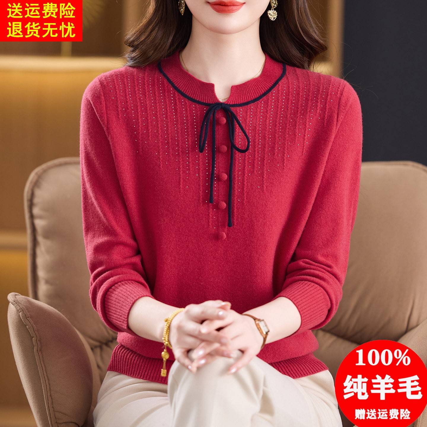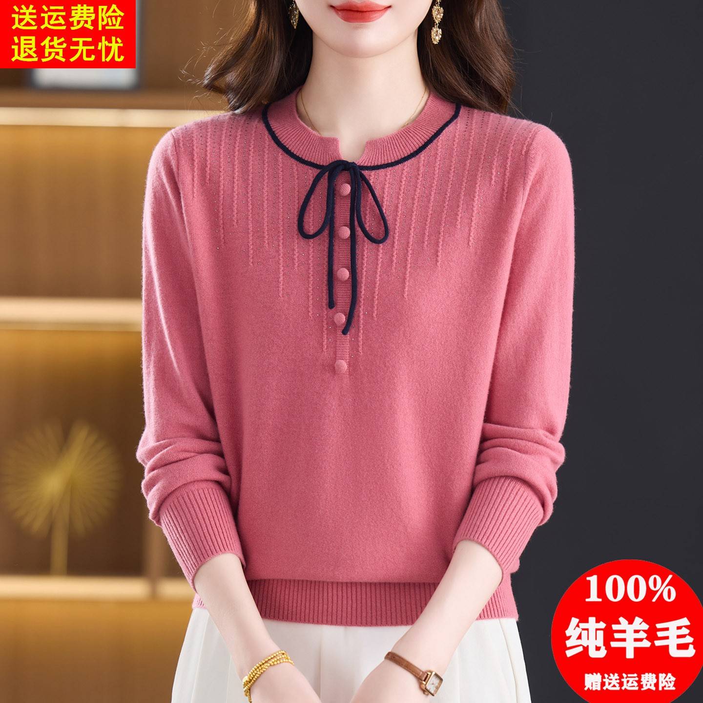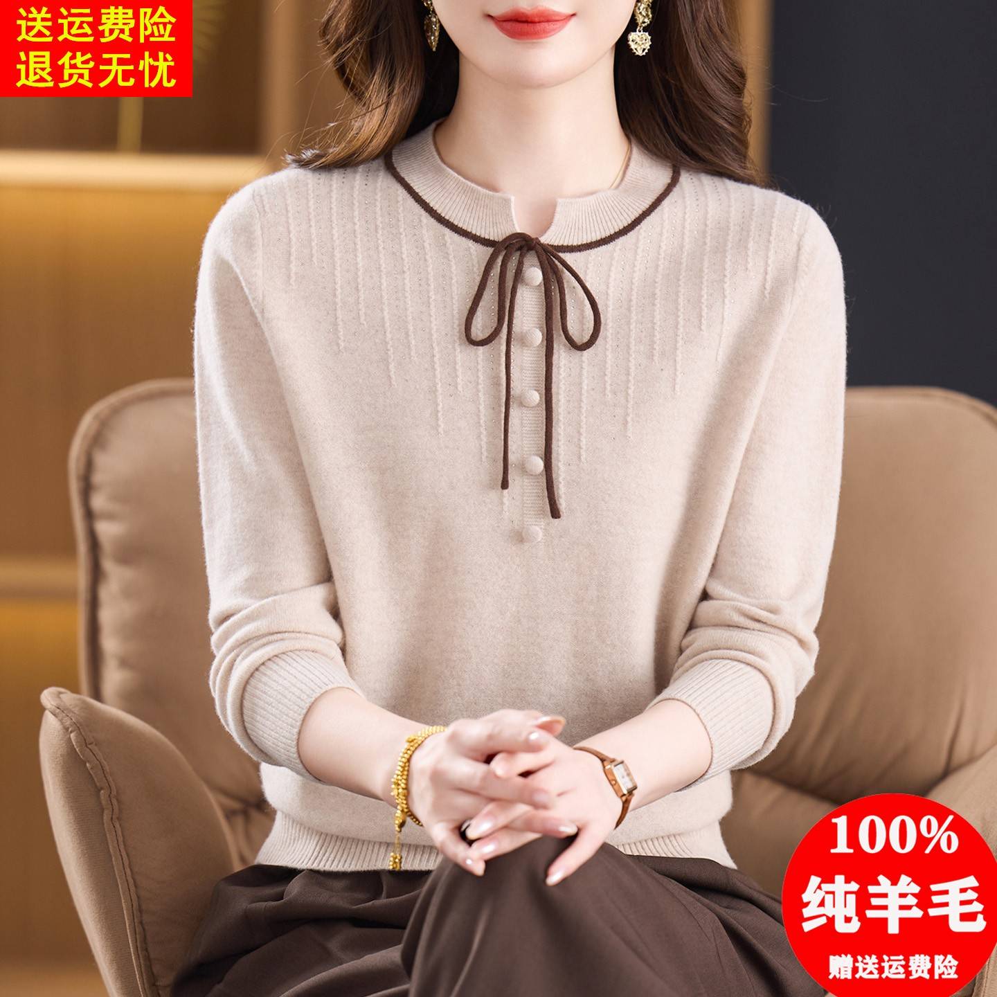 圆领系带100纯羊毛衫女套头毛衣秋冬宽松洋气上衣减龄针织打底衫