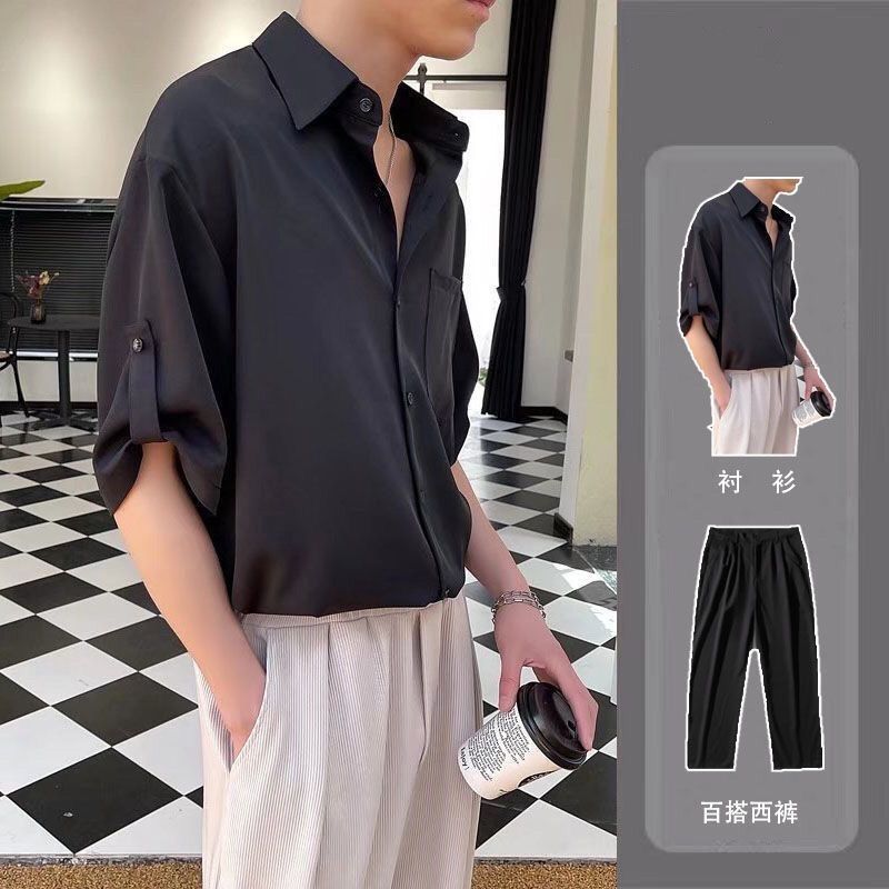 衬衫男女短袖韩版ins七分袖衬衣轻熟风痞帅夏季冰丝上衣两件套装