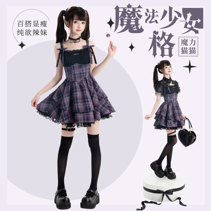 啦啦酱 魔力猫猫 纯欲风显瘦背心裙辣妹风开衫紫色格子连衣裙套装