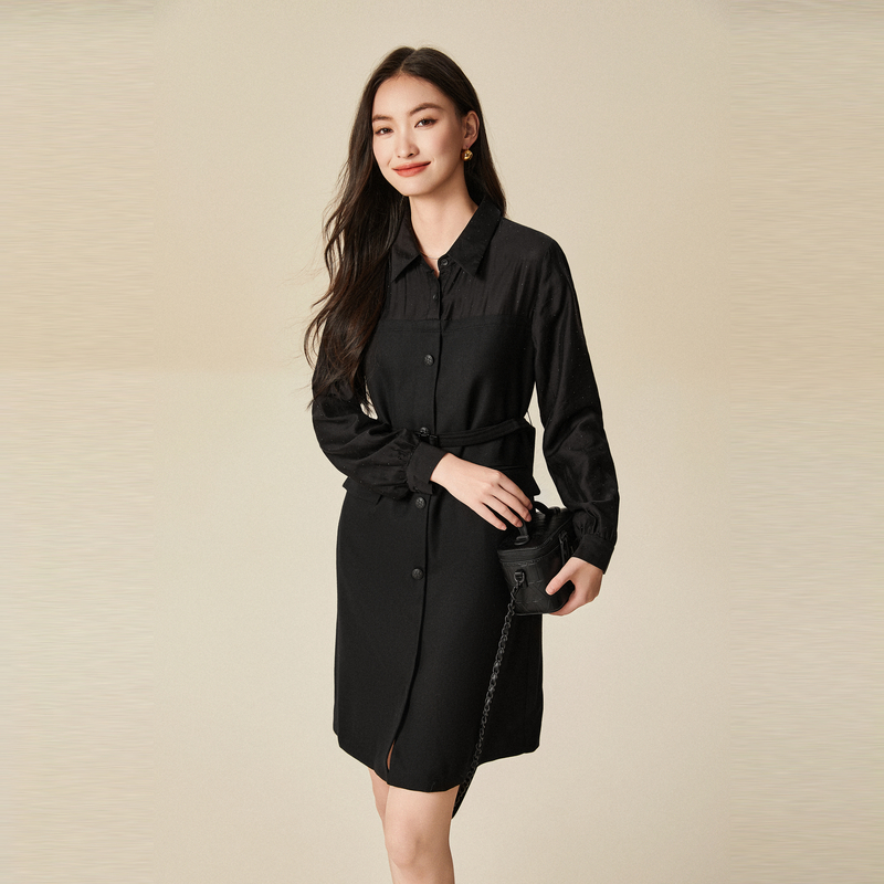 xg雪歌通勤黑色衬衫连衣裙女2024冬新款羊毛中长裙子XJ404012A690