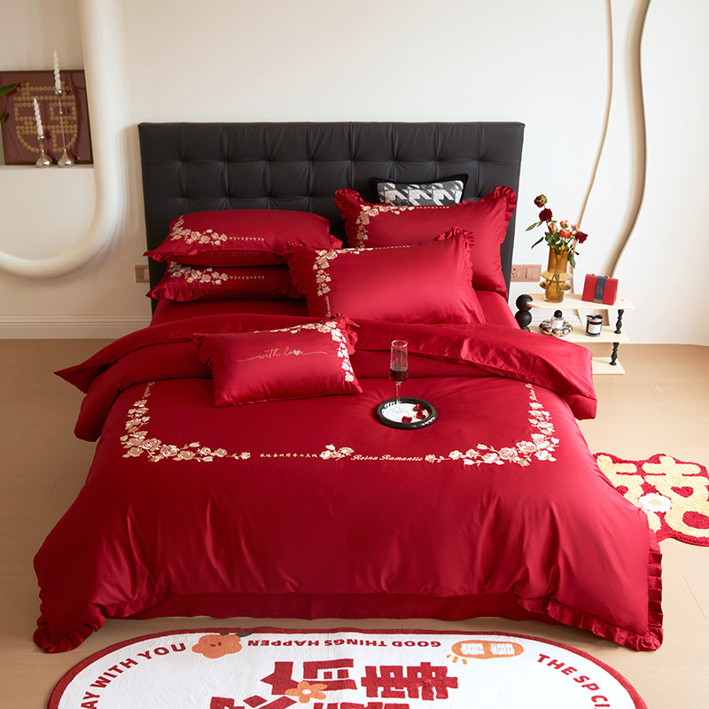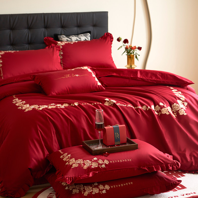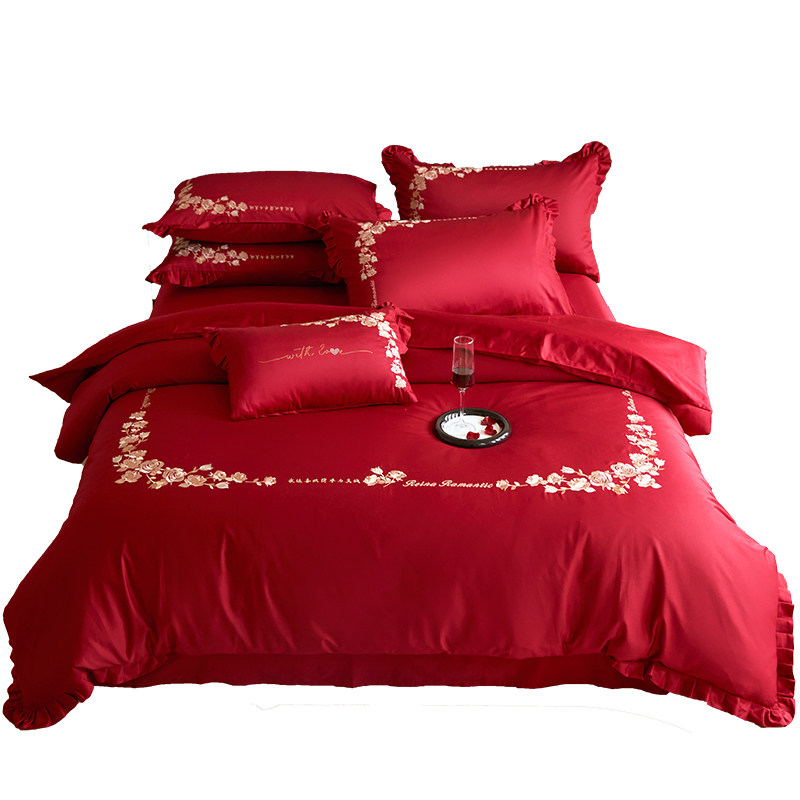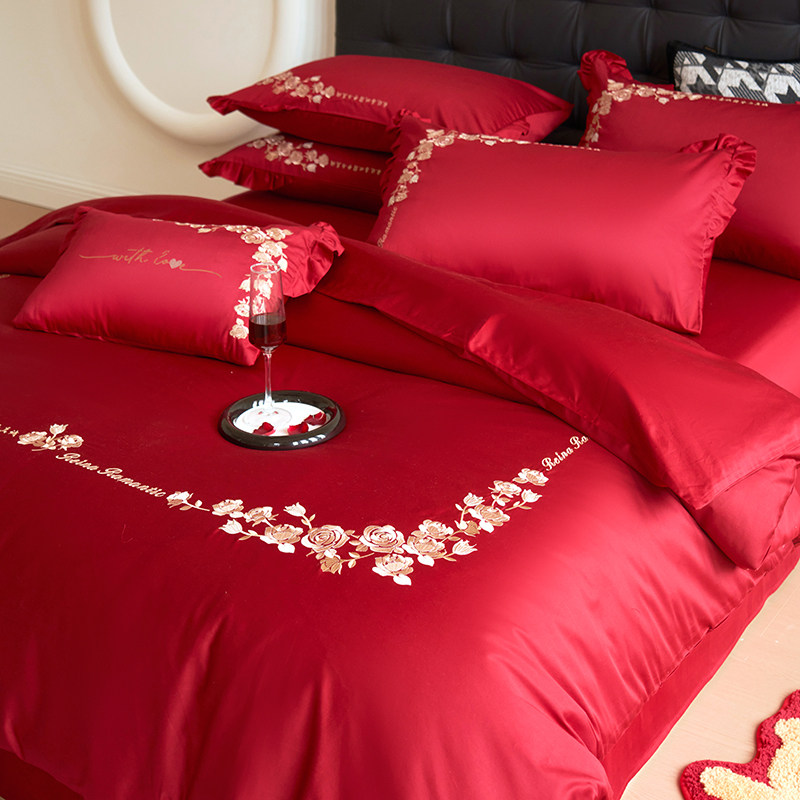 中式全棉结婚四件套100S长绒棉纯棉床单被套婚庆红色床上用品刺绣