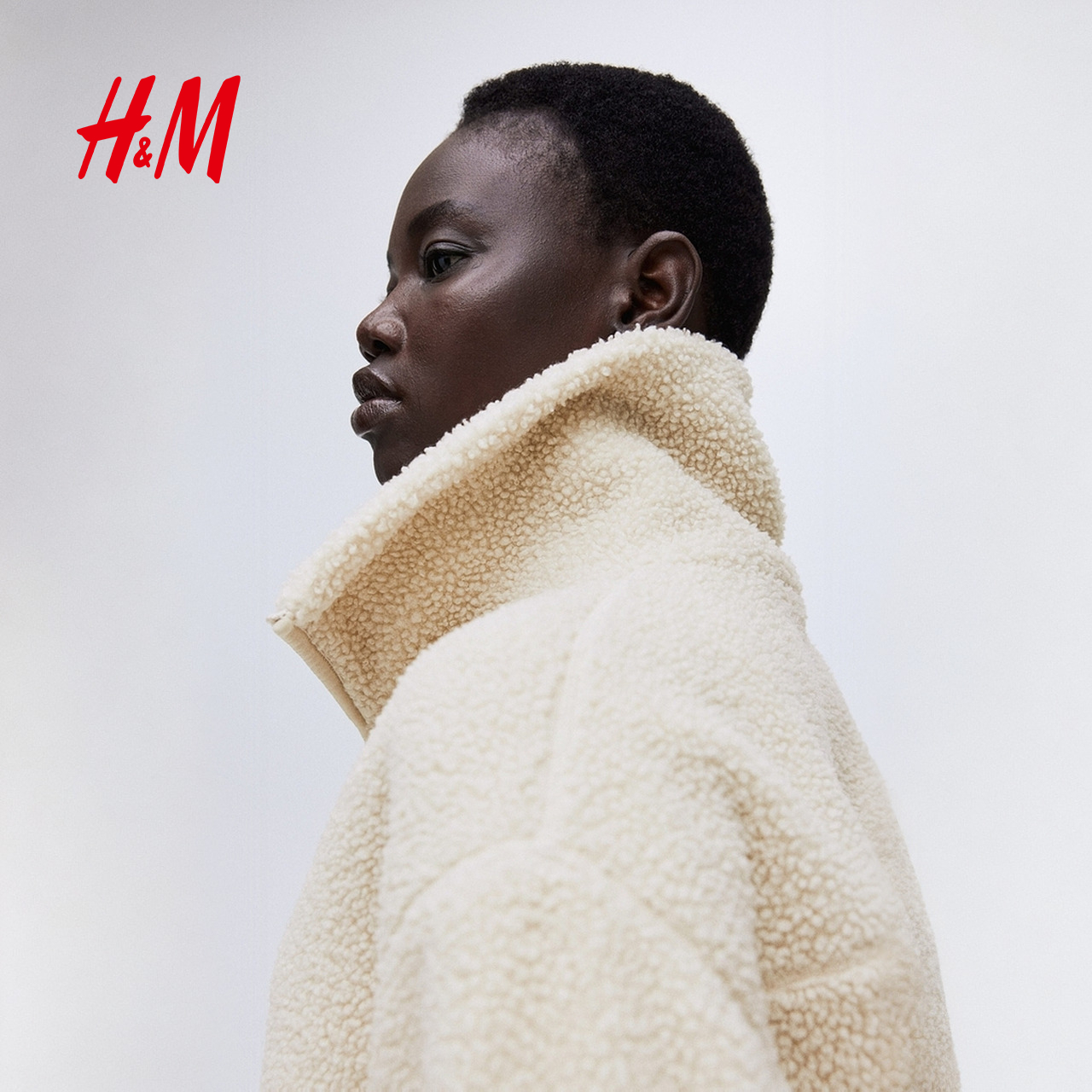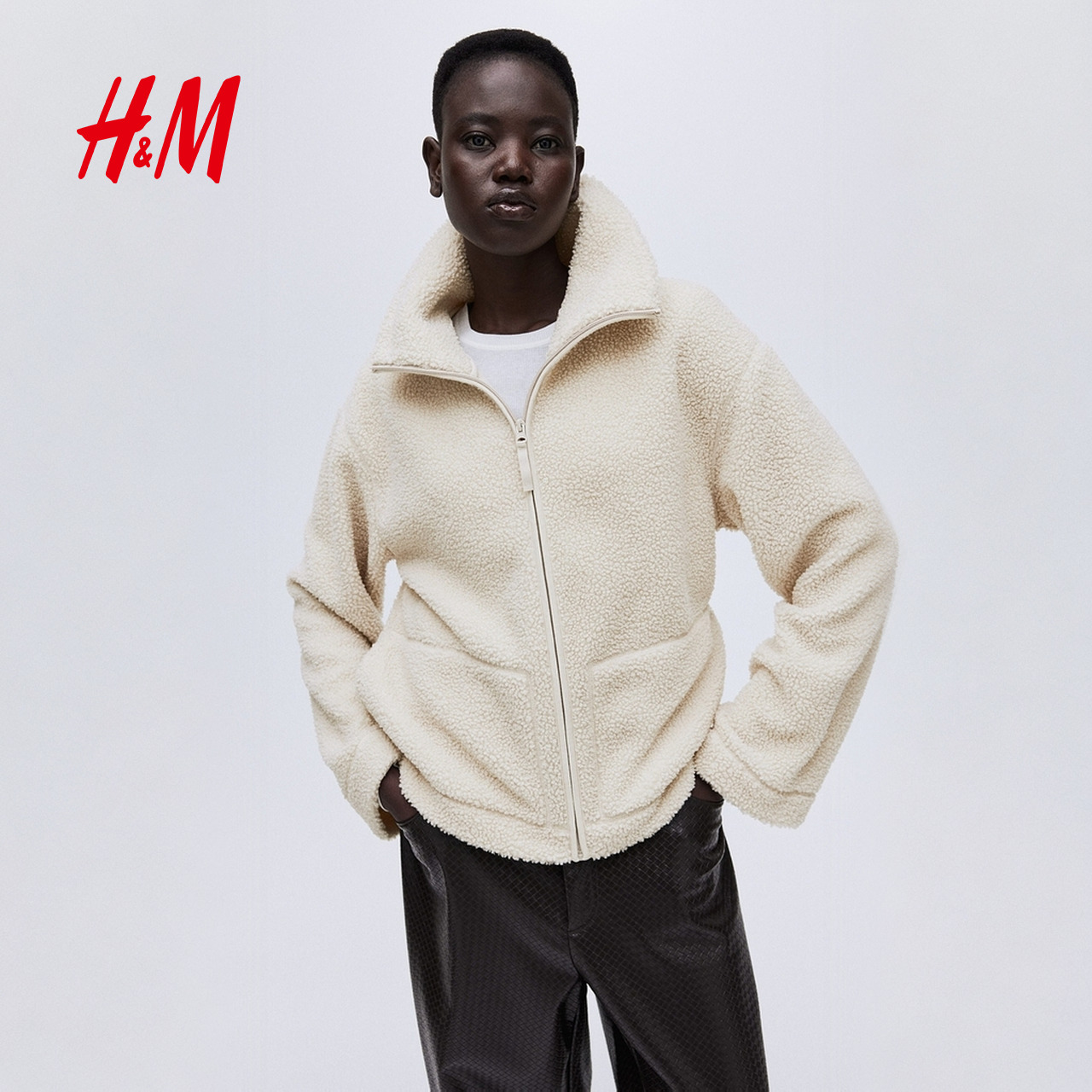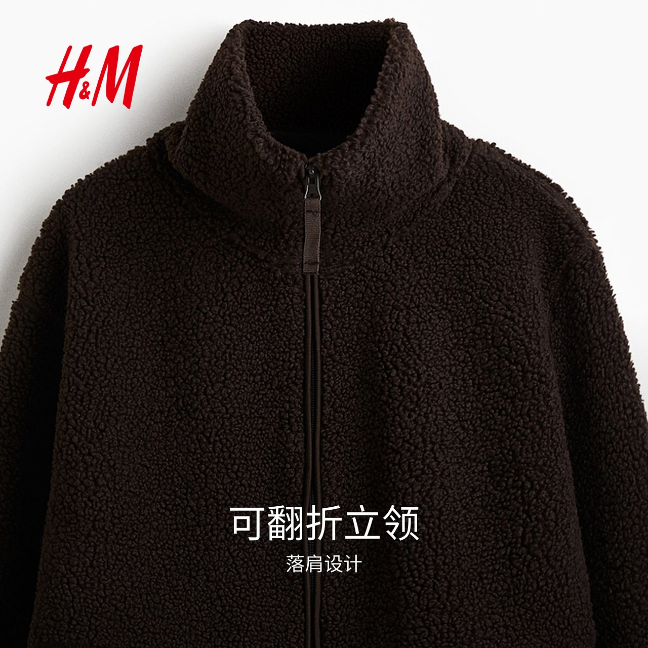 HM女装短外套2025新款拉链保暖时尚休闲泰迪绒酒红色外套1308677