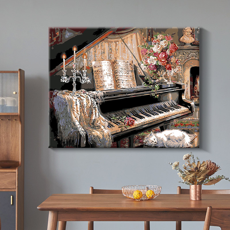 diy填充油画客厅装饰画手工水彩画填色涂色画解压数字画钢琴与猫