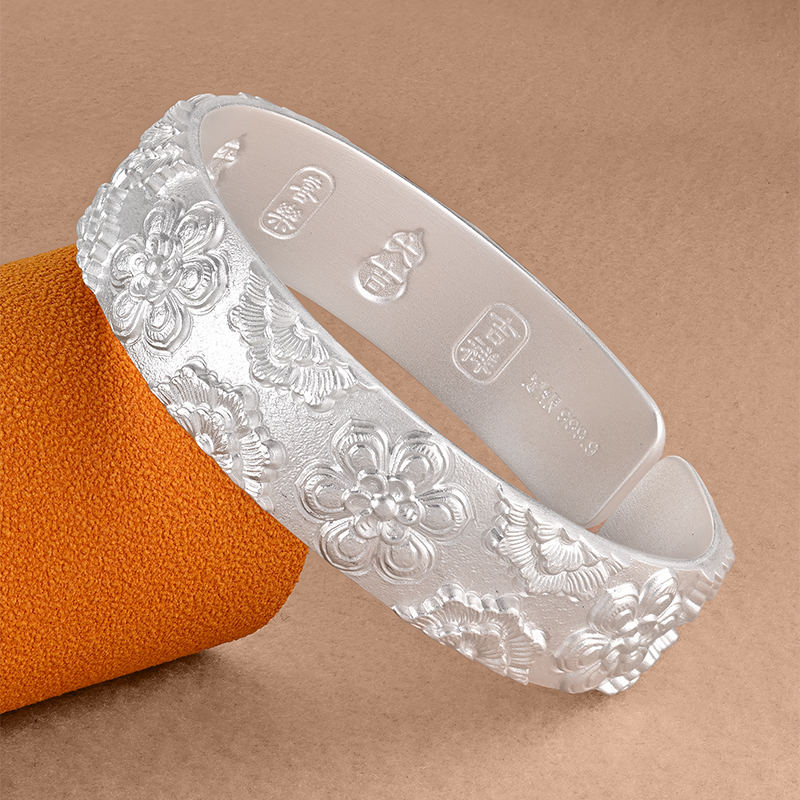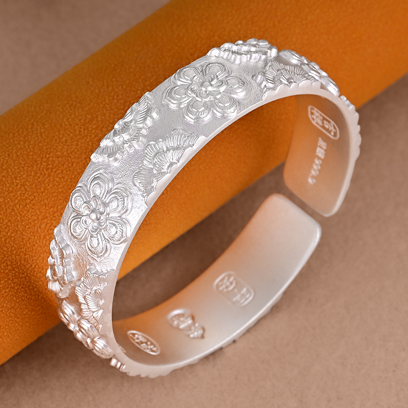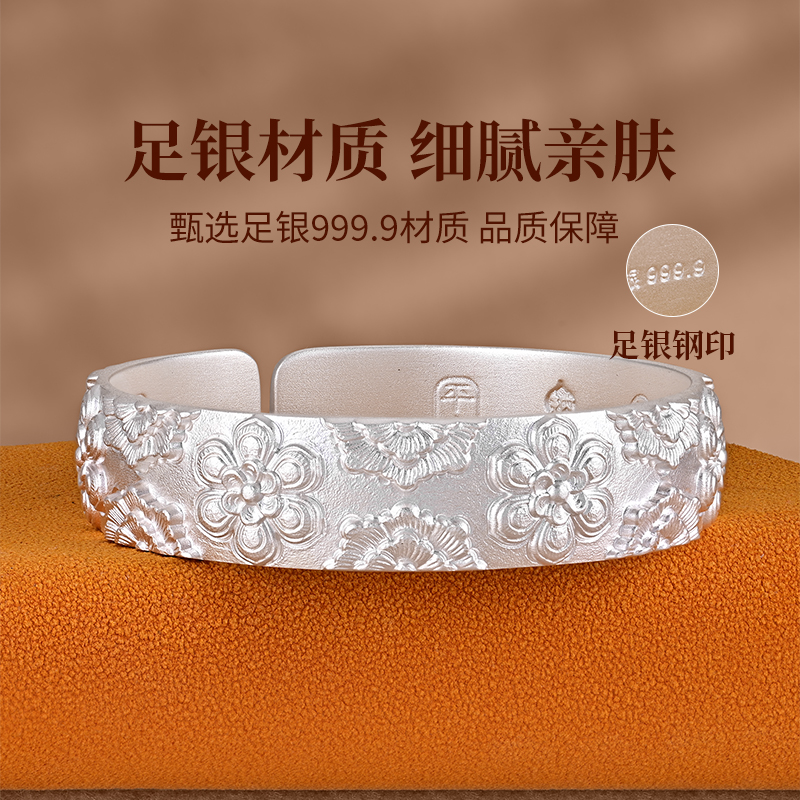 银千造 宝相花 足银999吉言宽版古法银手镯开口实心国风银镯子女