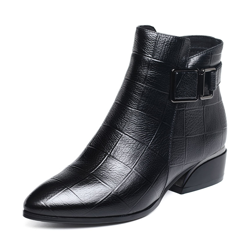 头层牛皮真皮短靴女靴子压花格新款单靴粗跟秋冬季加绒加厚马丁靴