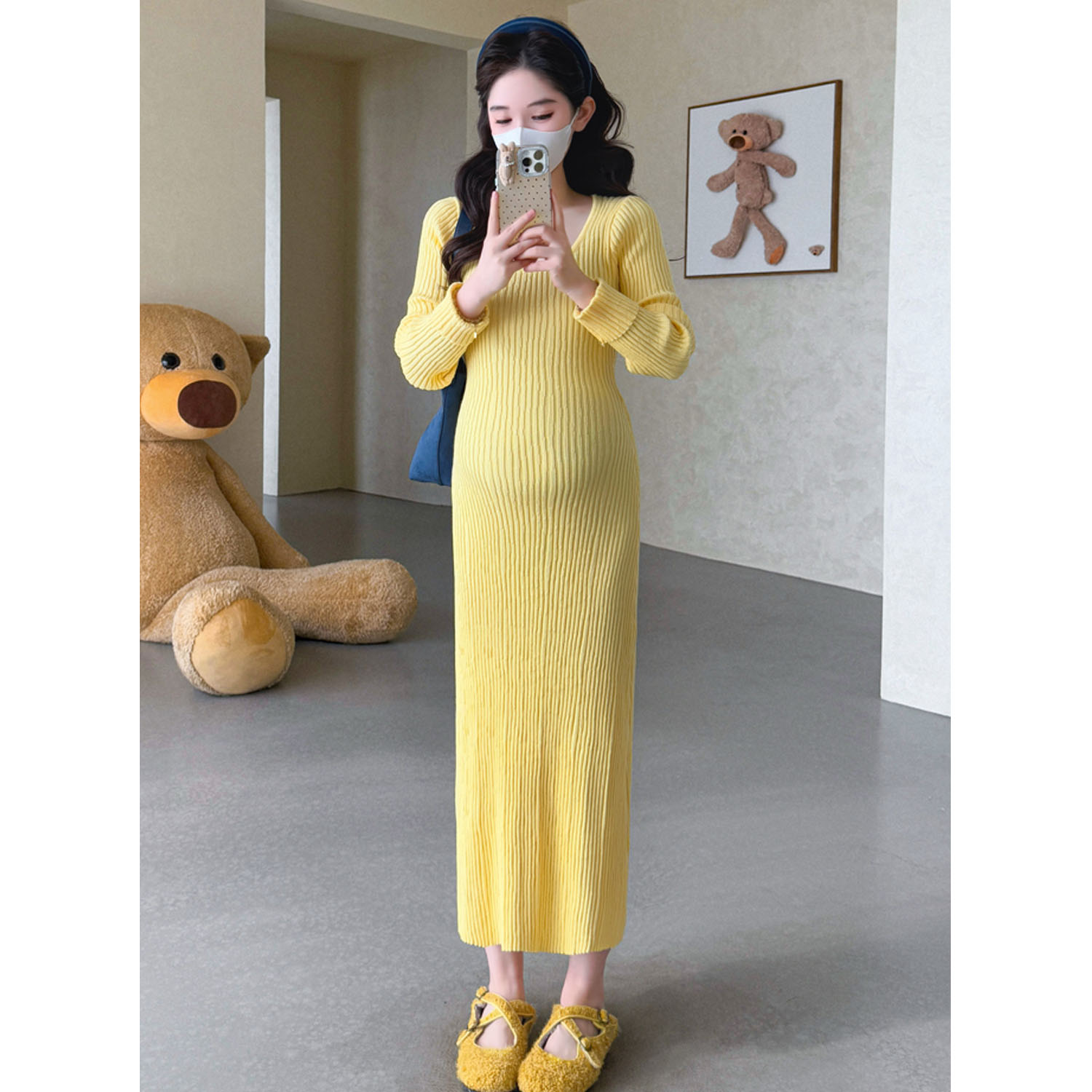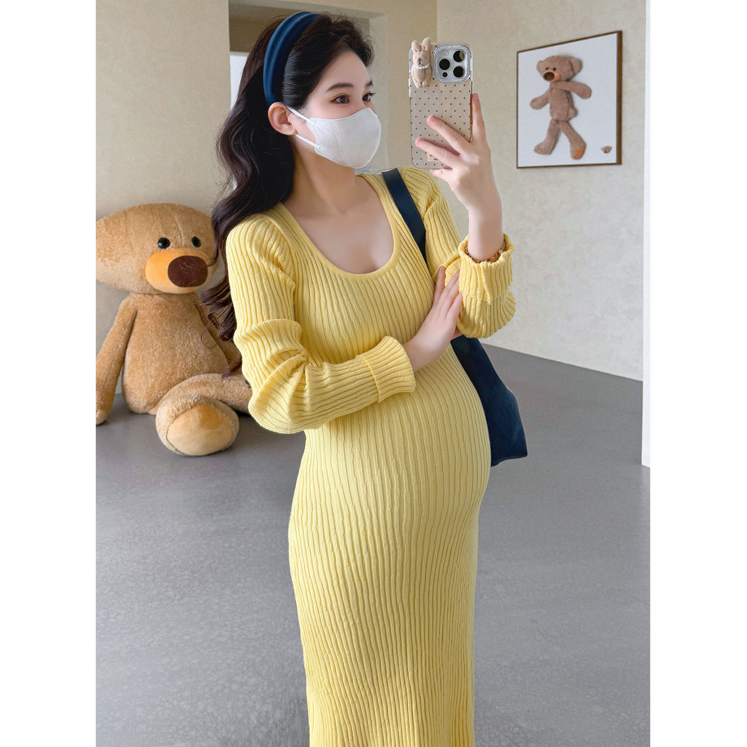 孕妇连衣裙秋冬2025新款时尚简约长袖修身显瘦打底内搭针织长裙子