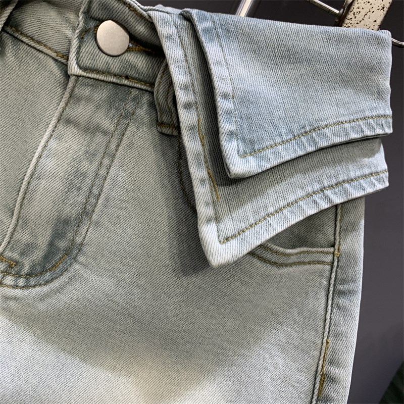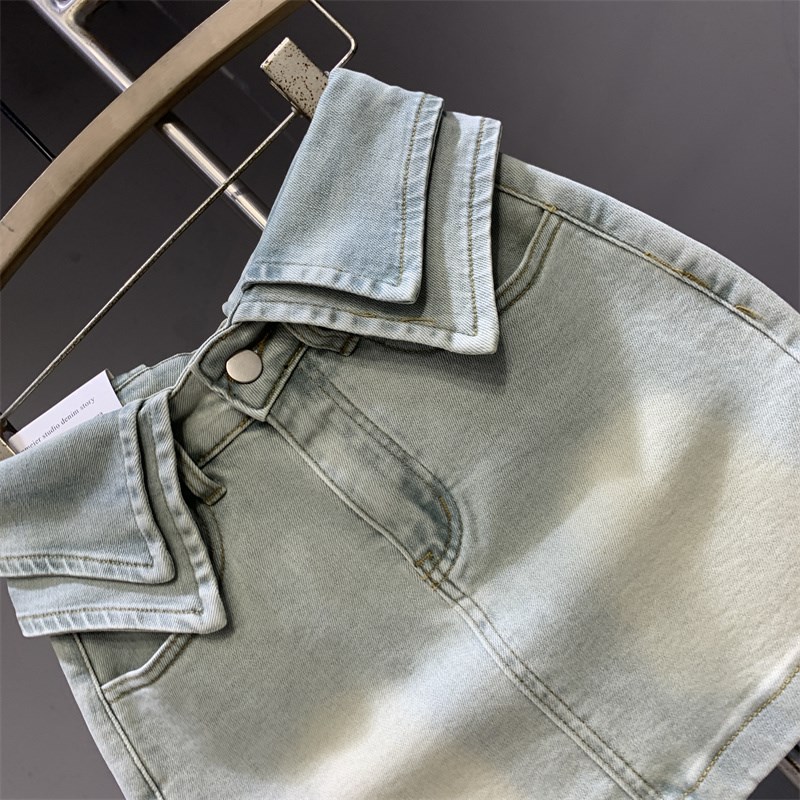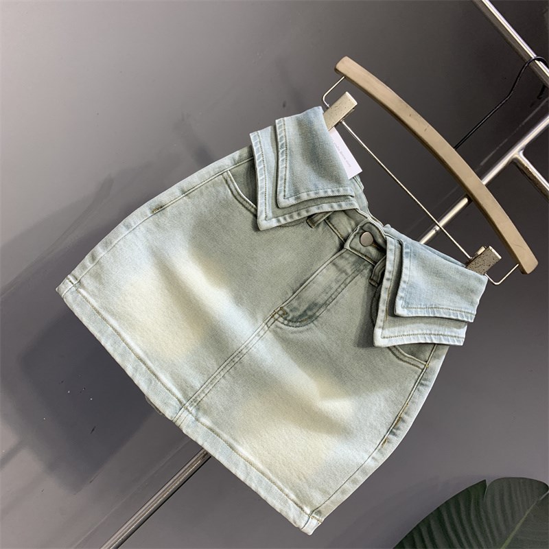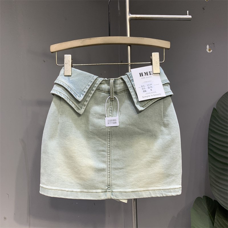 翻领高腰浅蓝色显瘦a字防走光半身裙女夏季辣妹风包臀牛仔短裙飒