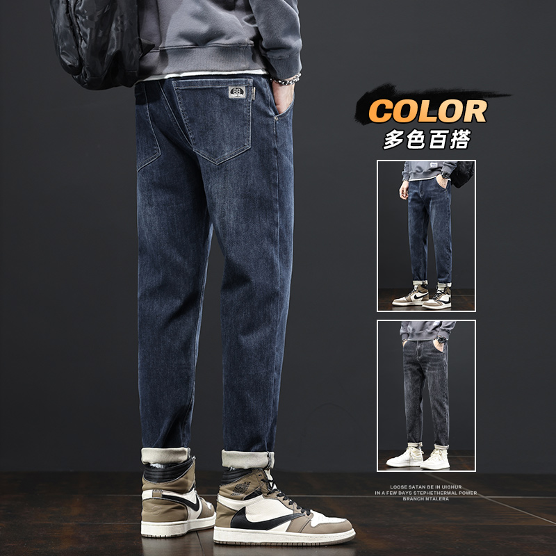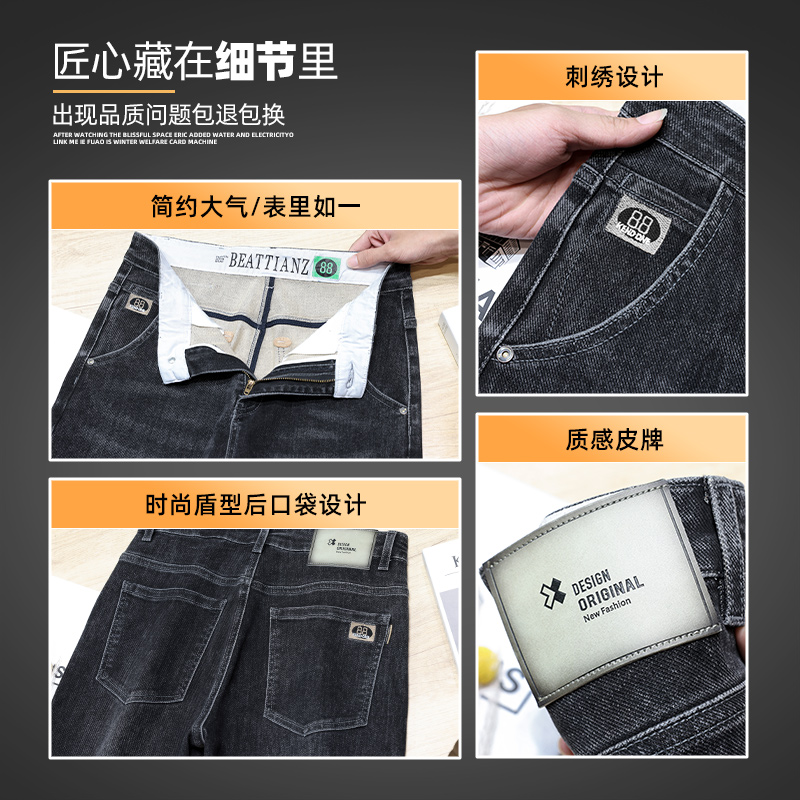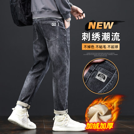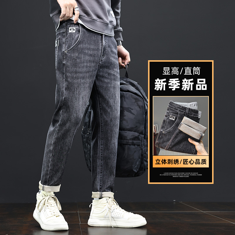 加绒加厚黑灰色牛仔裤男秋冬款修身直筒青年弹力男士休闲长裤裤子