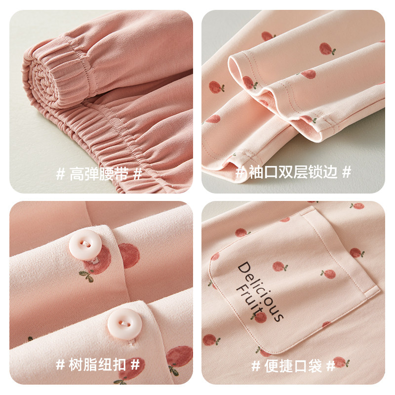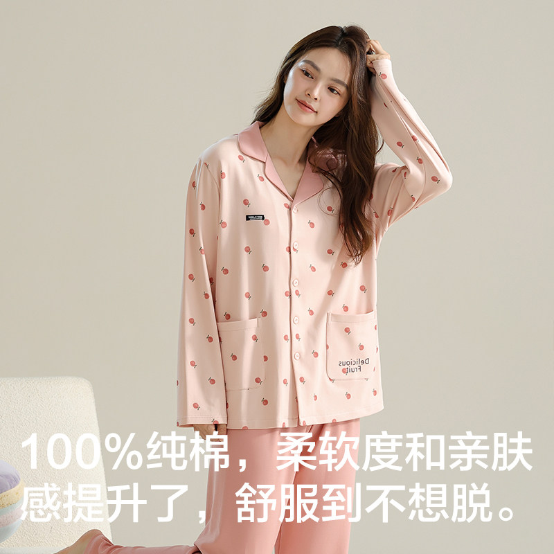 恒源祥纯棉睡衣女春夏款开衫粉色两件套全棉可外穿宽松翻领家居服