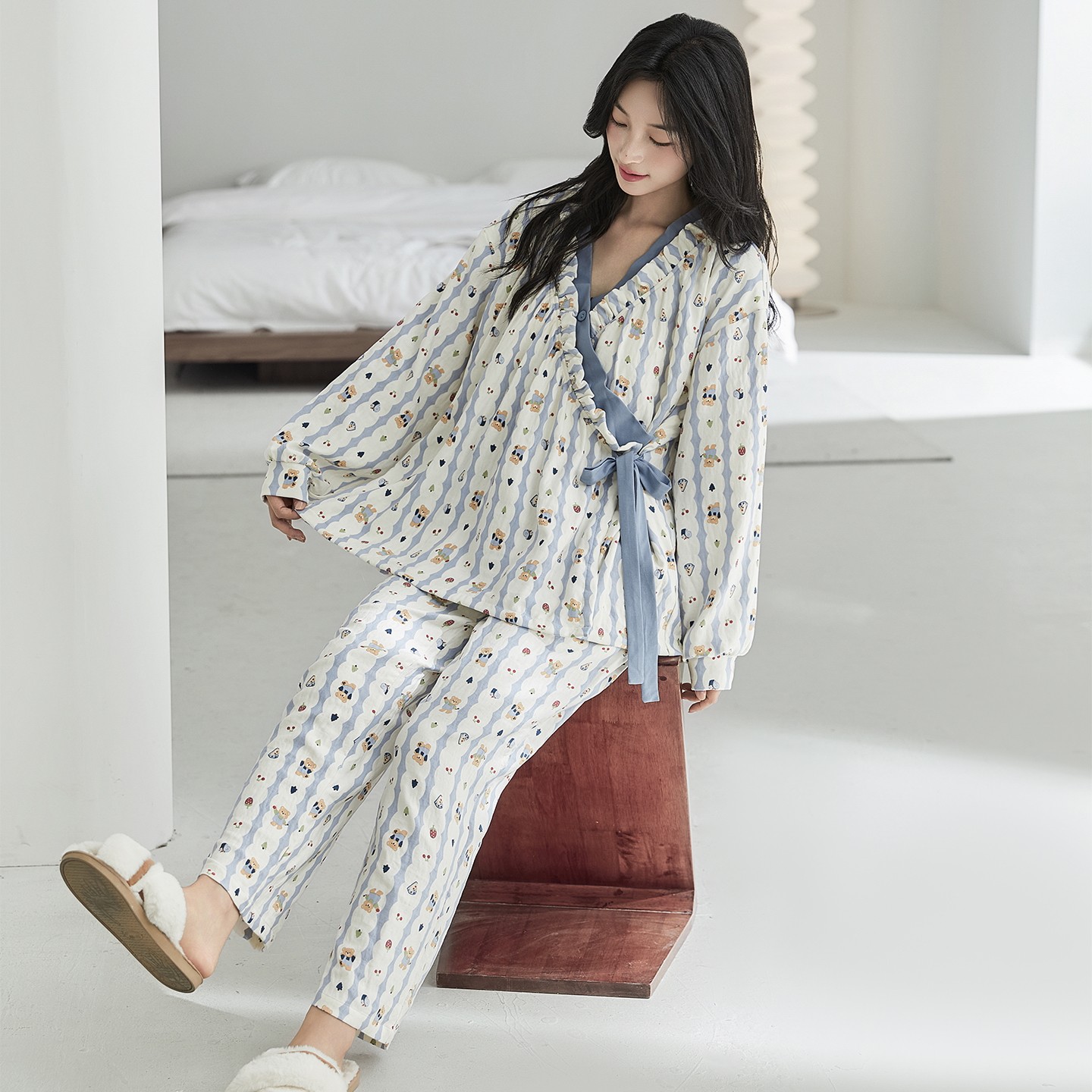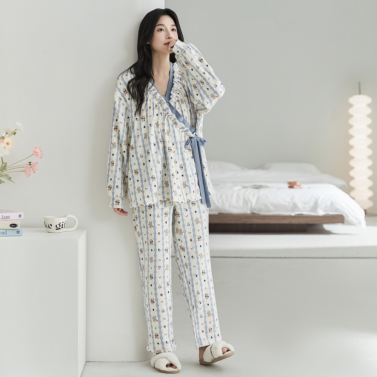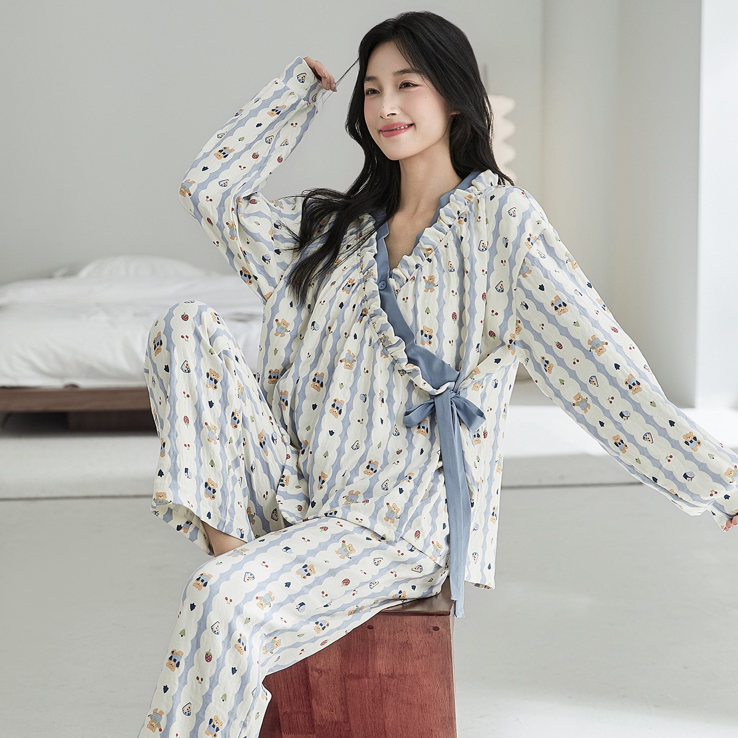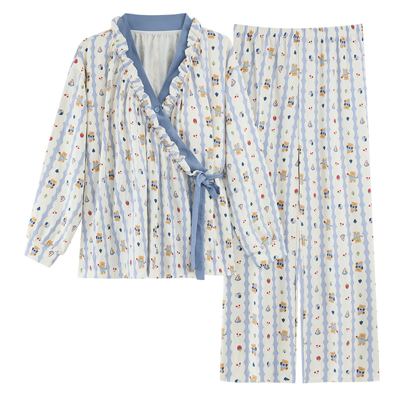 带胸垫云朵棉睡衣女士春秋季长袖和服卡通加大码月子服家居服套装