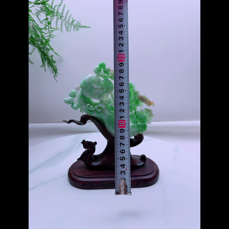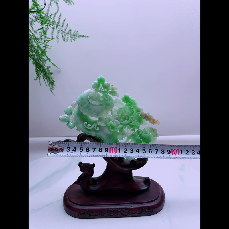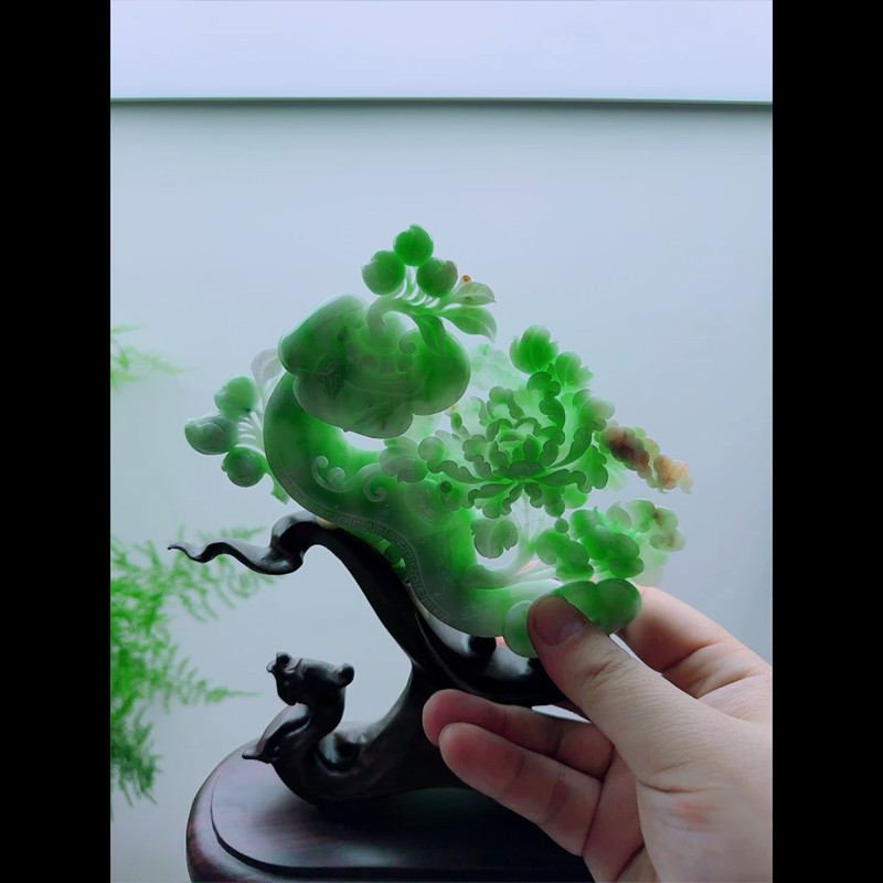 缅甸天然A货玉石翡翠孤品 精雕老坑双彩阳绿顺心如意花开富贵摆件