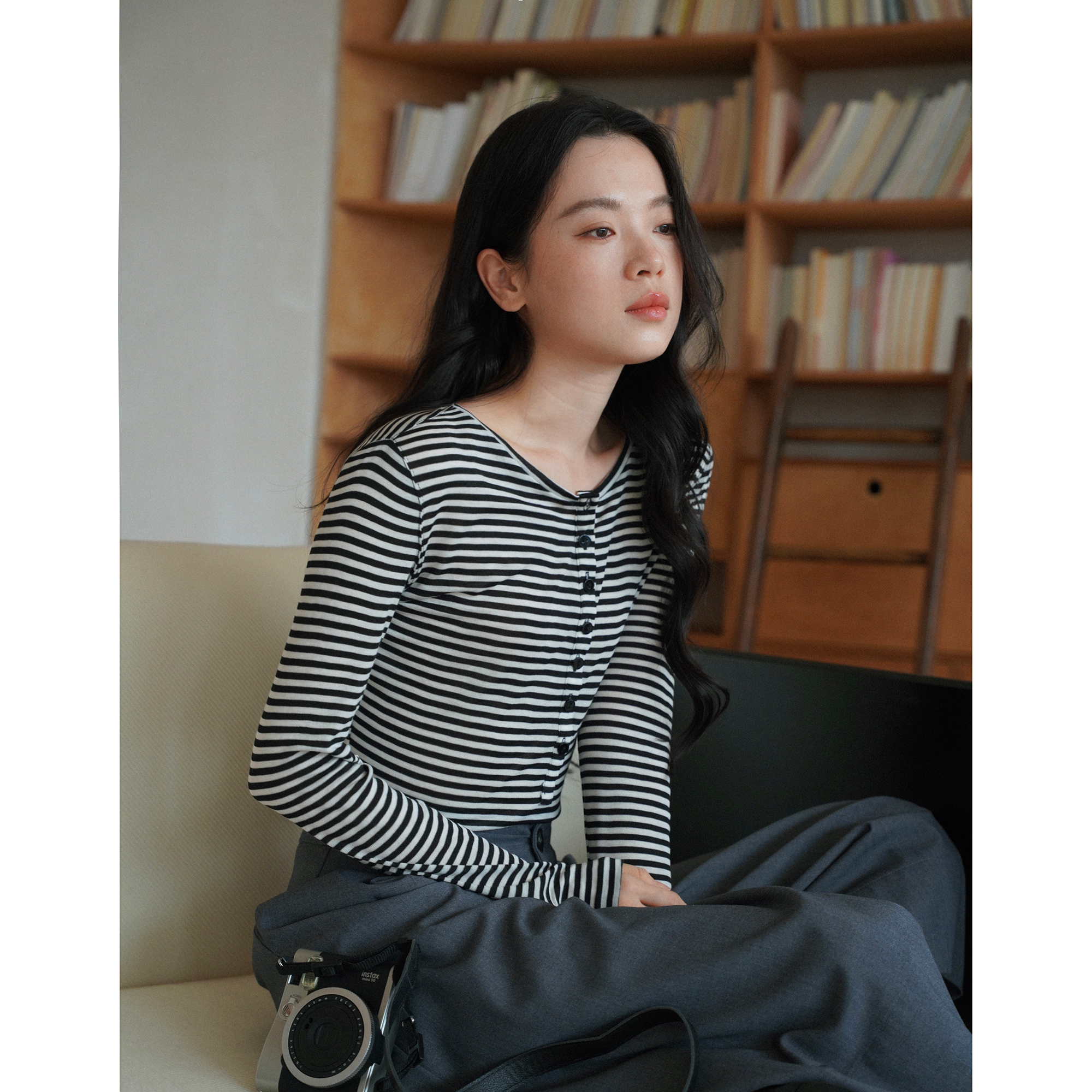 经典亨利领圆领天丝羊毛条纹打底衫长袖T恤女秋新款叠穿内搭上衣