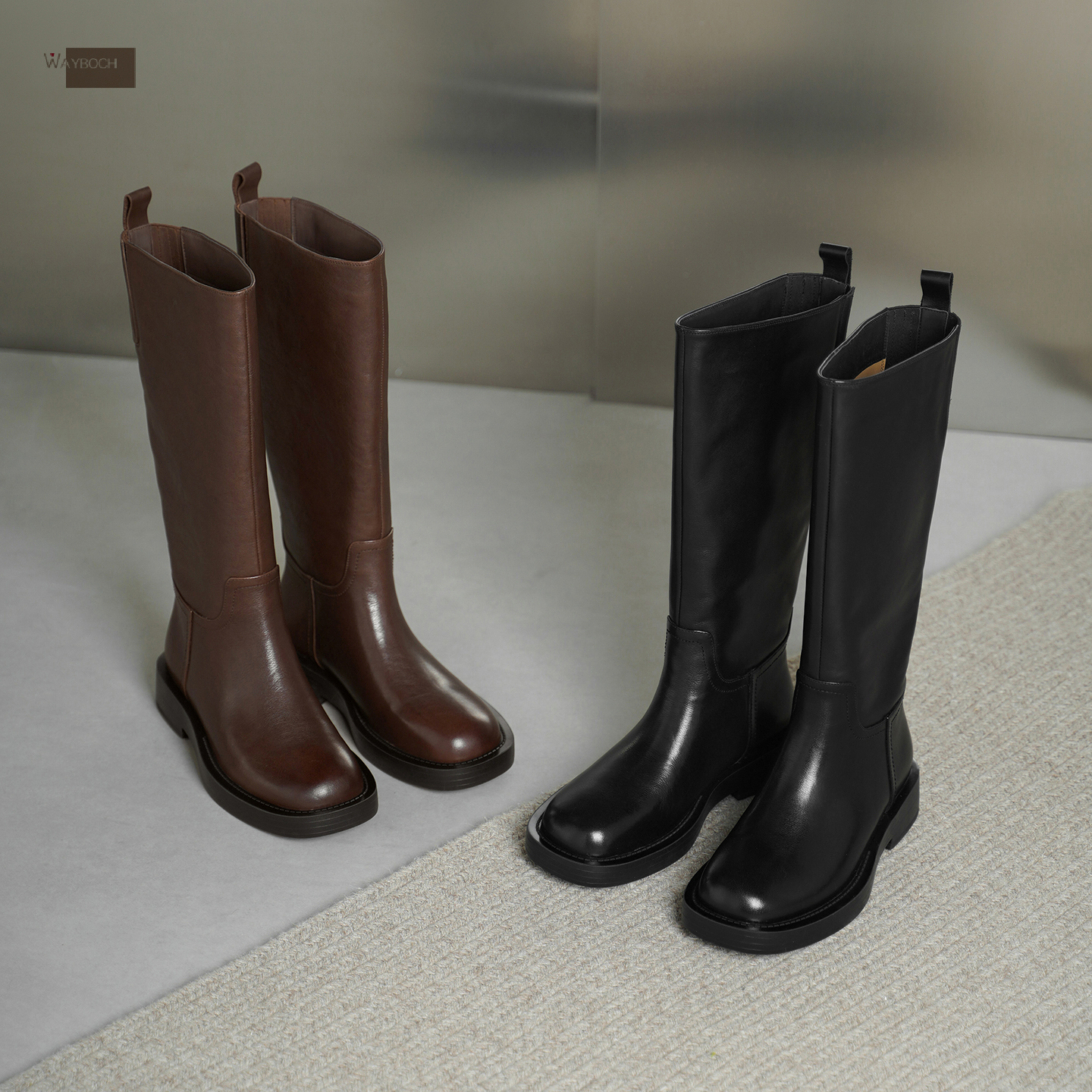 玮保/全真皮平跟厚底高筒骑士靴
