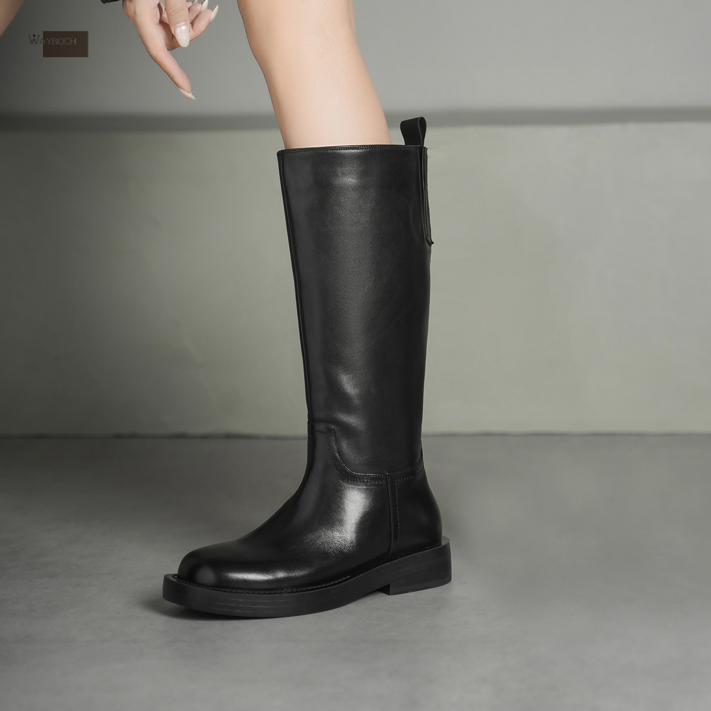 玮保/全真皮 平跟厚底高筒骑士靴女 圆头水台一脚蹬直筒靴子冬新