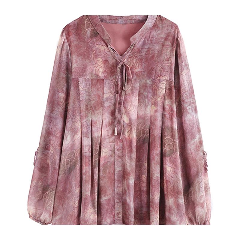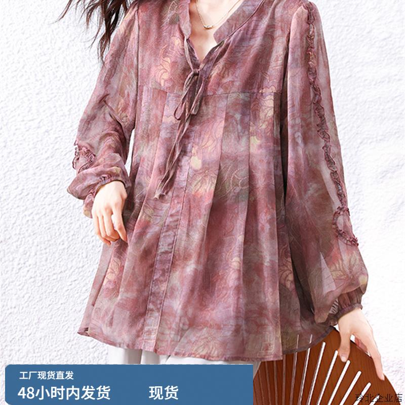 设计感压褶系带印花长袖雪纺衬衫女秋季新款别致漂亮小衫遮肉上衣